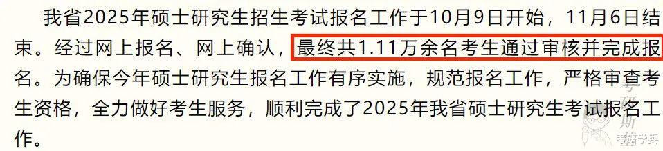 经过网上报名、网上确认,我省2025年硕士研究生招生考试最终共1.11万余名考生通过审核并完成报名。