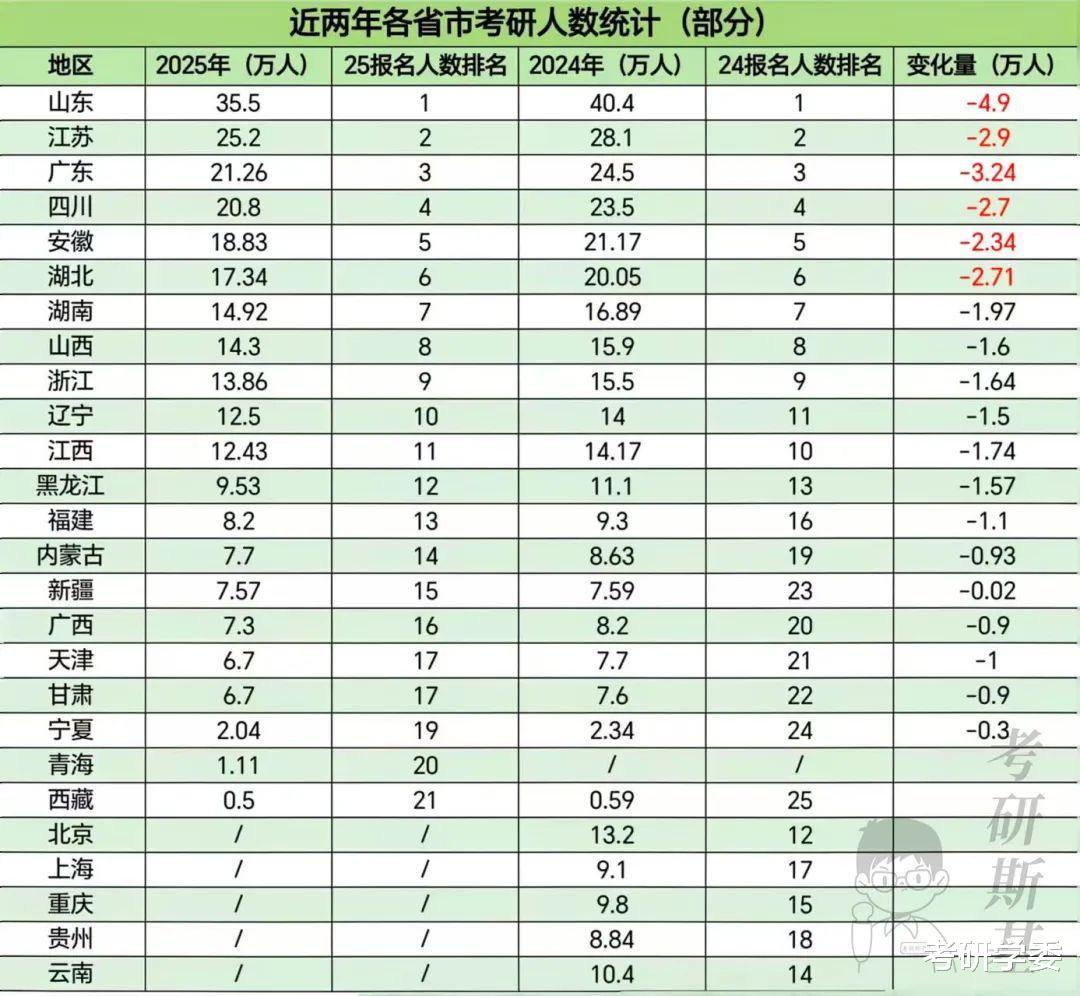 2.传统的考研大省即使报名人数削减了,但是基数依旧庞大。山东、江苏、广东、四川四个省份,分别连续两年报考人数都达到了20万人以上。