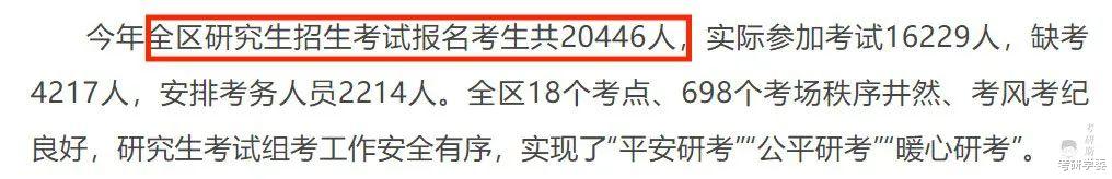 今年,宁夏全区研究生招生考试报名考生共20446人,实际参加考试16229人,缺考4217人。