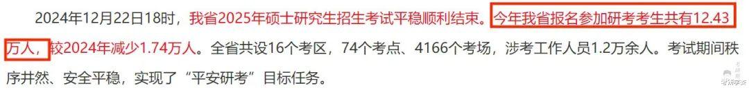 今年我省报名参加研考考生共有12.43万人,较2024年减少1.74万人。