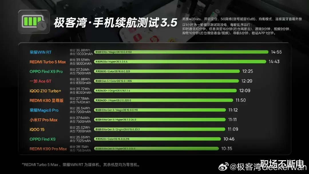 在这份覆盖11款热门机型的横评中,搭载9000mAh电池的红米Turbo 5 Max以14小时43分钟的成绩,仅落后10000mAh的荣耀WIN RT 12分钟,上演了“小电池逆袭”的名场面。