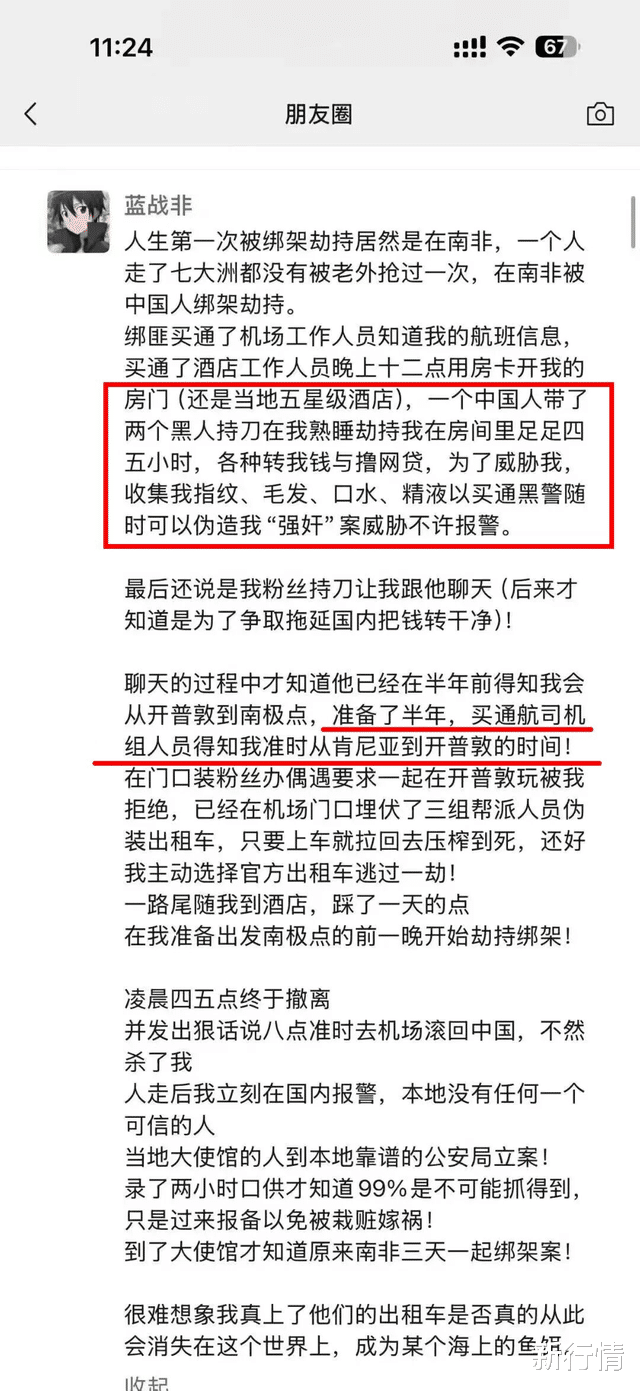 通过蓝战非的话,我们仿佛能看到当时惊心动魄的场景:在南非开普敦一家五星级酒店内被一人伙同两名黑人持刀劫持,事件持续四五小时。绑匪据称买通机场与酒店人员,掌握其行程,并试图胁迫其转账、申请网贷,同时收集指纹、毛发、精液等生物信息以威胁伪造“强奸”案阻止报警。
