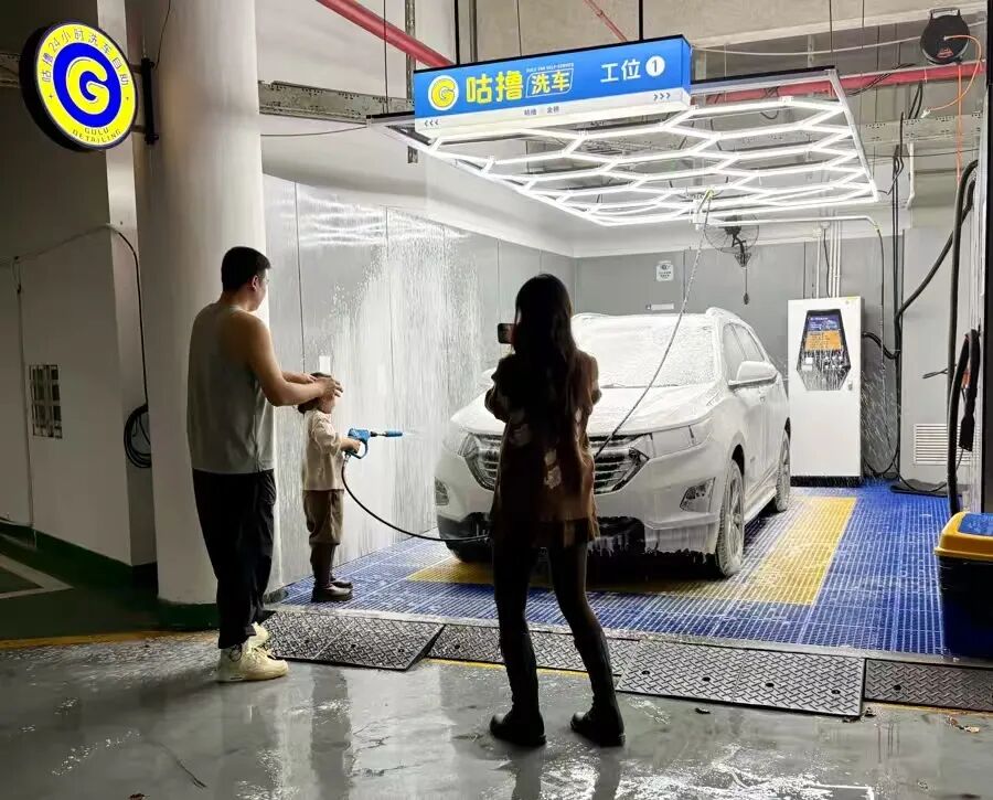 走近一看,一台智能扫码机器、几支高压水枪、一堆泡沫喷洒设备,外加几位正在兴致勃勃擦拭爱车的车主,构成了一个热火朝天的微型场景。