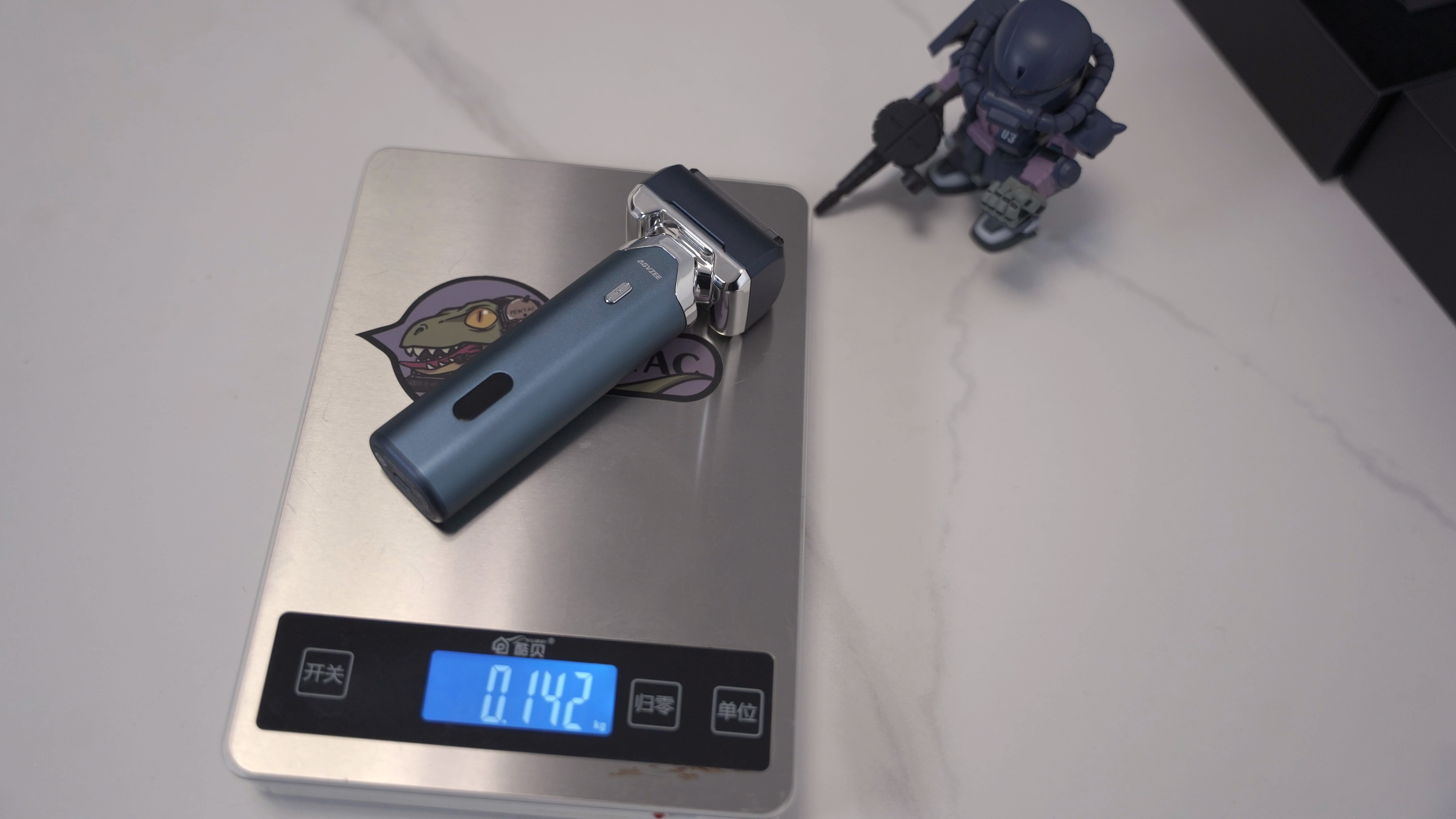 虽然是采用全金属机身,但是剃须刀带电池的重量实测仅为142g,还不到一个手机的重量,非常轻便。