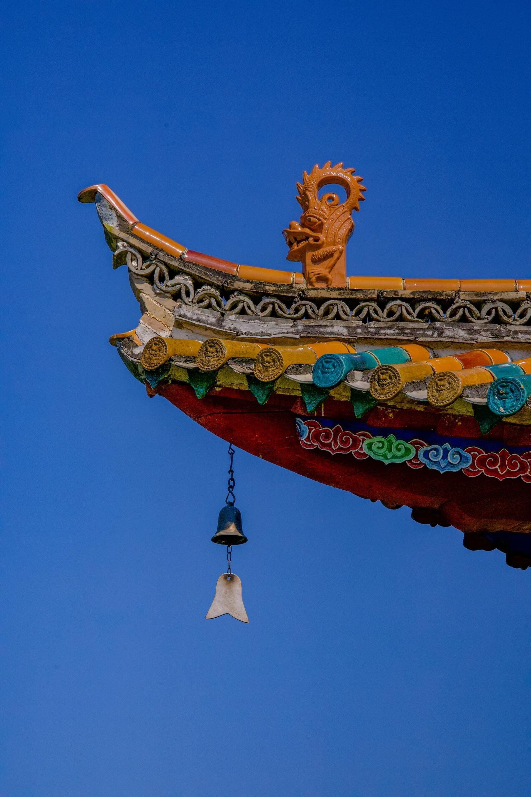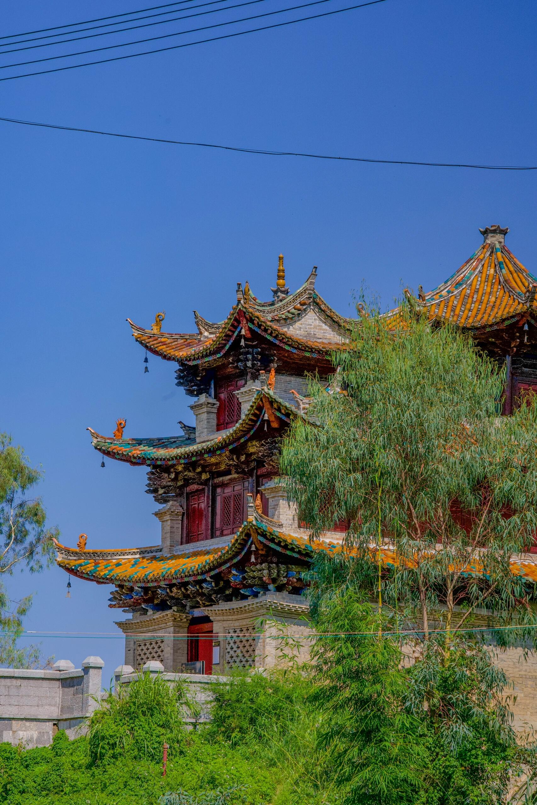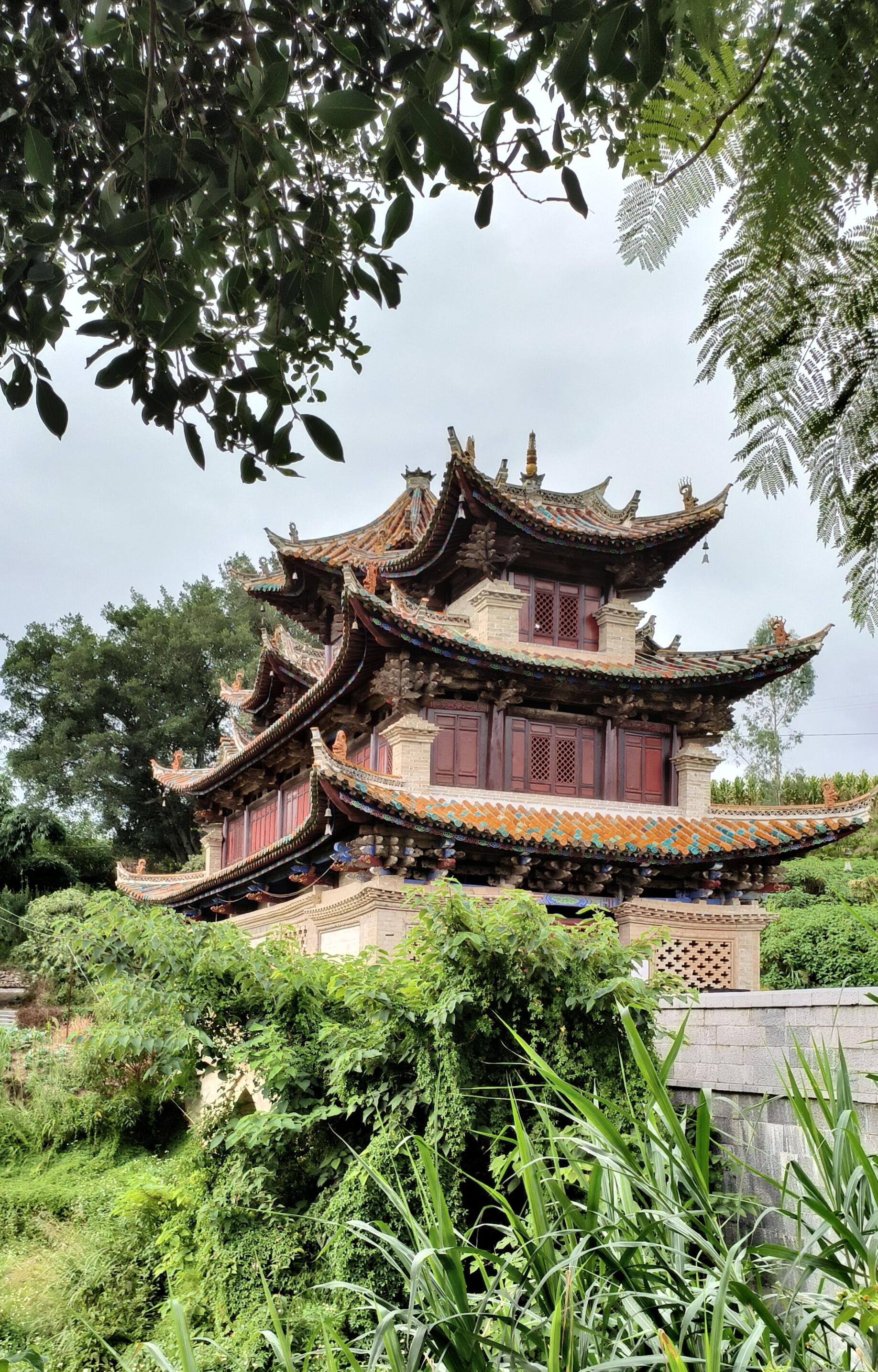 阁顶的装饰更是堪称一绝。彩色琉璃瓦在阳光下折射出斑斓的光影,红、黄、绿、蓝等色彩交织在一起,艳而不俗,与异龙湖的碧水、岸边的绿树相映成趣。陶制的飞禽走兽镶嵌在屋脊与檐角,造型各异,栩栩如生,有的昂首啼鸣,有的俯身凝视,仿佛在守护着这座水畔楼阁。更妙的是,每层每个亭角都悬挂着一枚风铃,微风拂过,铃声清脆悦耳,穿透林间的静谧,回荡在水面之上。那铃声不似寺庙钟声那般厚重,也不似市井喧嚣那般杂乱,而是清冽中带着温润,悠远中藏着宁静,让人恍惚间仿佛置身深山古刹,所有的浮躁与喧嚣都被这铃声涤荡干净,只剩下内心的平和与安宁。