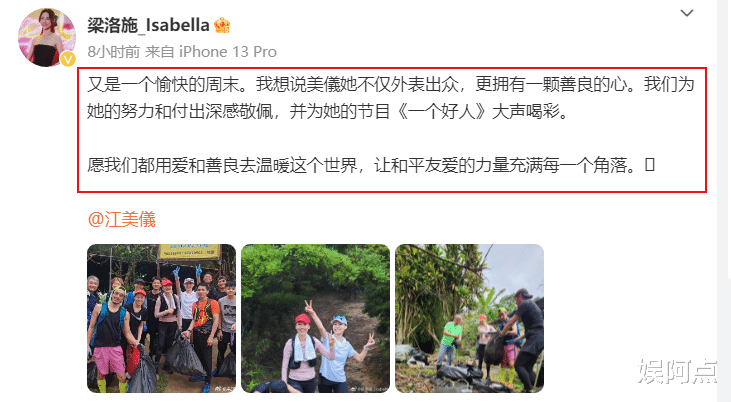 4月1日,梁洛施在社交平台上分享了一组去户外做公益的照片,可谓满满的正能量,瞬间获得了无数粉丝们的赞美。