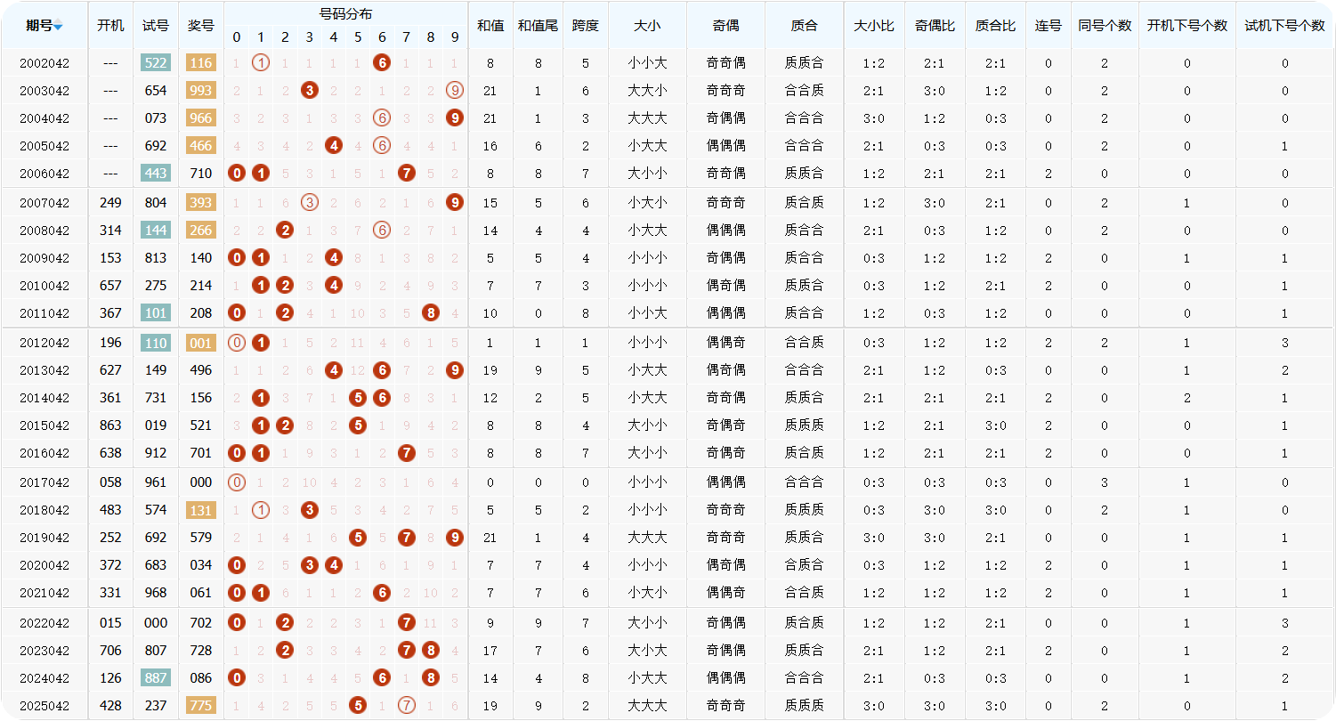 福彩3D第043期条件分析金银胆码 上期开出号码7-7-5,号码和值19,跨度2,形态为大大大,奇奇奇。 1、和值方面最近30期和值5、14、15表现最活跃,本期看好和值9、16、11。 2、跨度方面,最近30期开出最多的是跨度5和6,跨度0已经遗漏32期没有开出,本期看好跨度5、8。 3、本期号码形态大大大遗漏6期开出,开奖后,遗漏最多的是形态大大小 ,遗漏18期。 4、本期号码形态奇奇奇遗漏4期开出,开奖后,遗漏最多的是形态奇偶奇 ,遗漏15期。 综合以上分析,本期看好和值9、16、11;跨度5、8;金胆0银胆9;杀号3、1。 福彩3D第043期直选号码分析 上期开出号码7-7-5,百位大数奇数,十位大数奇数,个位大数奇数。号码奇偶比3:0,大小比3:0。 百位:上期开出遗漏6期的号码7,目前百位遗漏最多的号码是5,遗漏16期。本期看好开出号码2876 十位:上期开出遗漏6期的号码7,目前十位遗漏最多的号码是5,遗漏22期。本期看好开出号码7068 个位:上期开出遗漏36期的号码5,目前个位遗漏最多的号码是4,遗漏26期。本期看好开出号码9206 福彩3D第043期组选号码分析 上期开出号码7-7-5,从组选走势表看,号码7遗漏3期开出,号码7遗漏3期开出,号码5遗漏15期开出。本期号码形态为组三。 1、目前组选号码遗漏最多的是号码6,遗漏6期没有开出。 2、最近30期,12期开奖均包含号码6,号码6为最热号码。其次是号码0有10期开出,号码4有9期开出。 3、本期奖号开出无连号,目前组选连号组合遗漏1期。 4、本期奖号为组三形态,目前组六形态遗漏4期。 综合以上分析,本期看好组选号码0245678