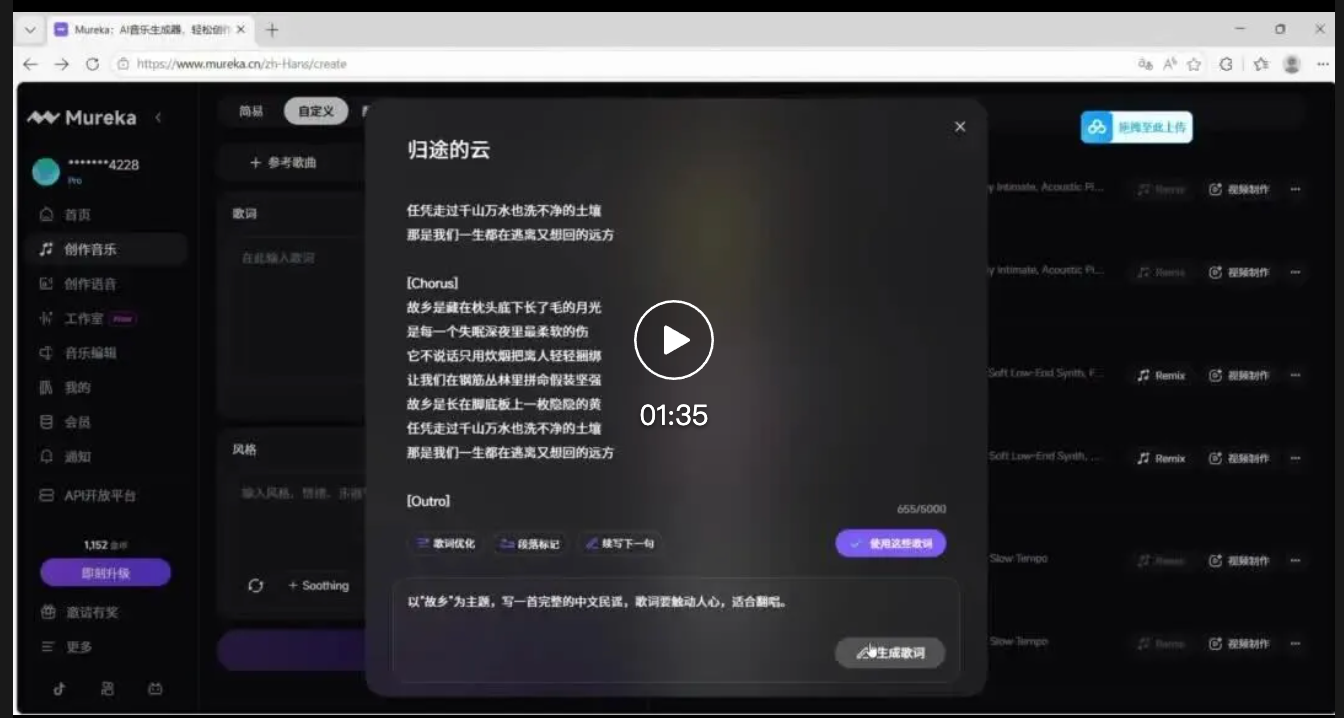 接下来,我想试试它能不能理解更厚重、更东方的情感。Prompt很简单:“以‘故乡’为主题,写一首完整的中文民谣,歌词要触动人心,适合翻唱。”