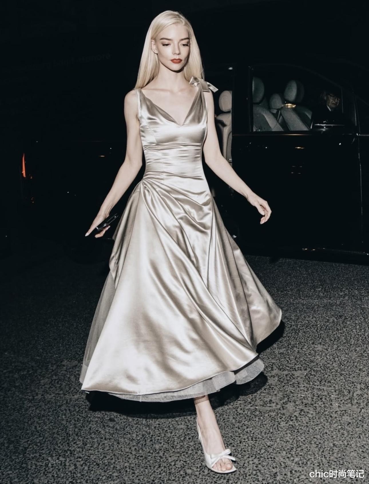 在选择缎面裙的时候一定要注意选择好面料、简约设计的款式,落落大方中自带高级感,随意搭配手拿包和带钻高跟鞋,凸显贵气~