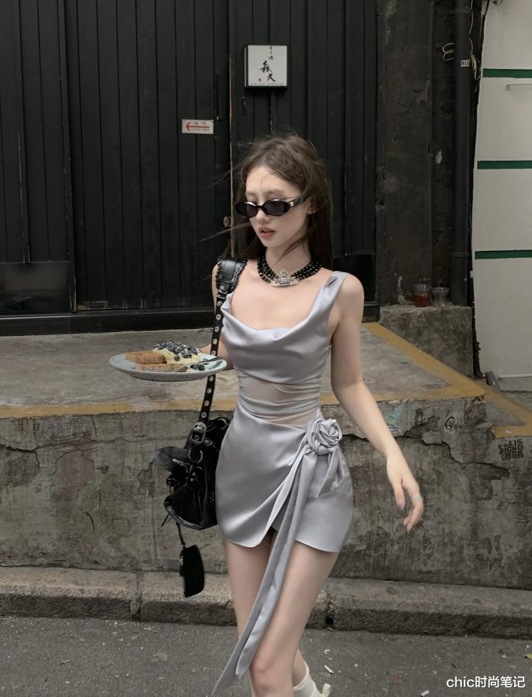 缎面裙竟也能穿出辣妹时髦感!银灰色荡领缎面短裙上点缀着玫瑰花和飘带,腰间做了收腰设计更能展现腰身,妥妥的辣妹。