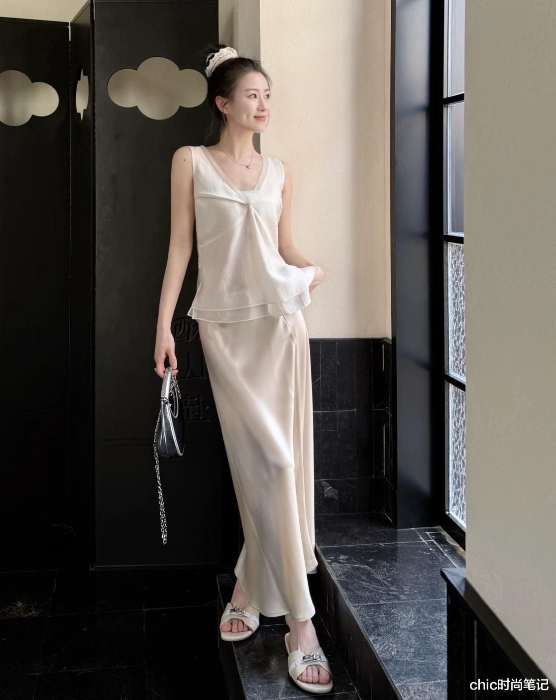 今年非常流行的缎面裙安雅早已上身。缎面裙强调光泽感与质感并存,配上利落高级的设计和剪裁,轻松打造优雅、从容的穿搭。