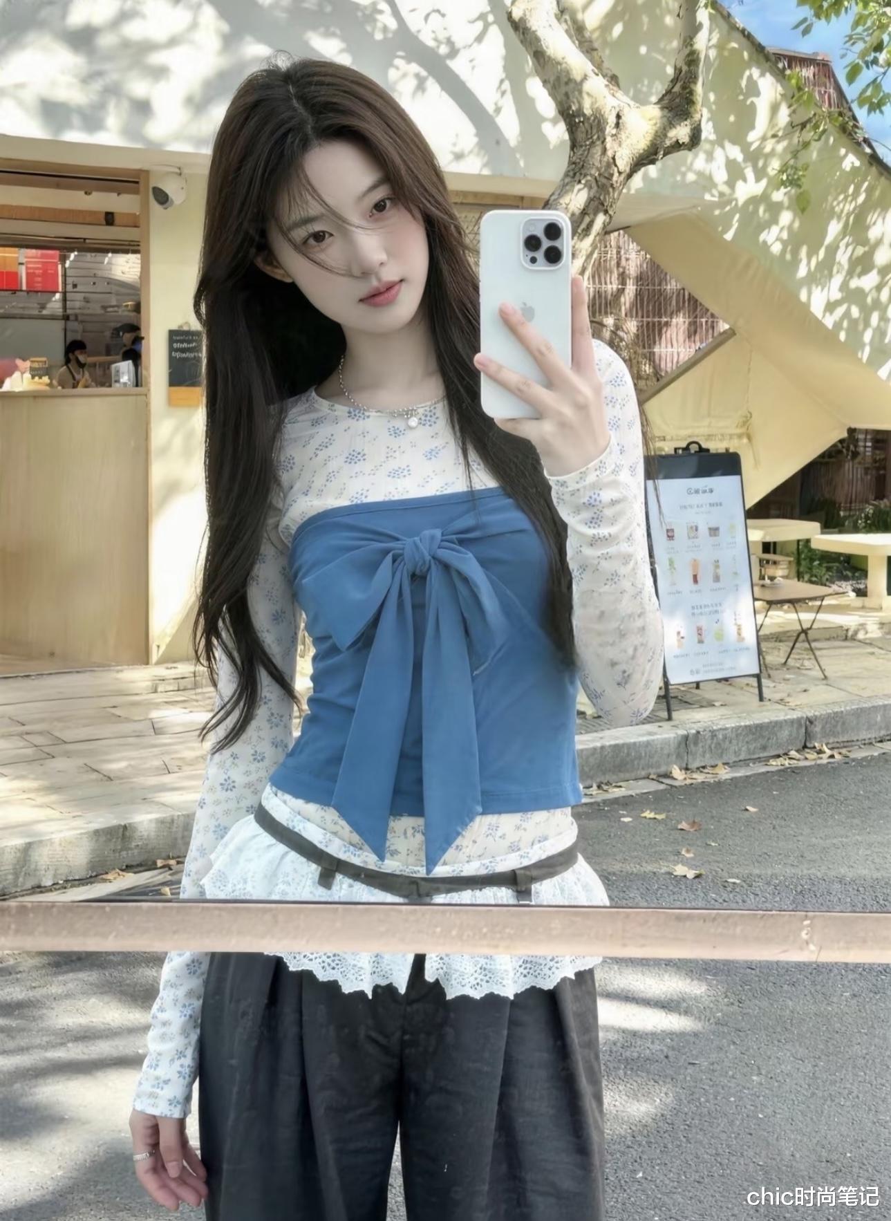 碎花上衣叠穿蝴蝶结抹胸,叠穿法更具层次感与细节,通过不同颜色的两件单品来达到穿搭的融合和统一。下身搭配灰色系阔腿裤,舒适中自带时髦感。