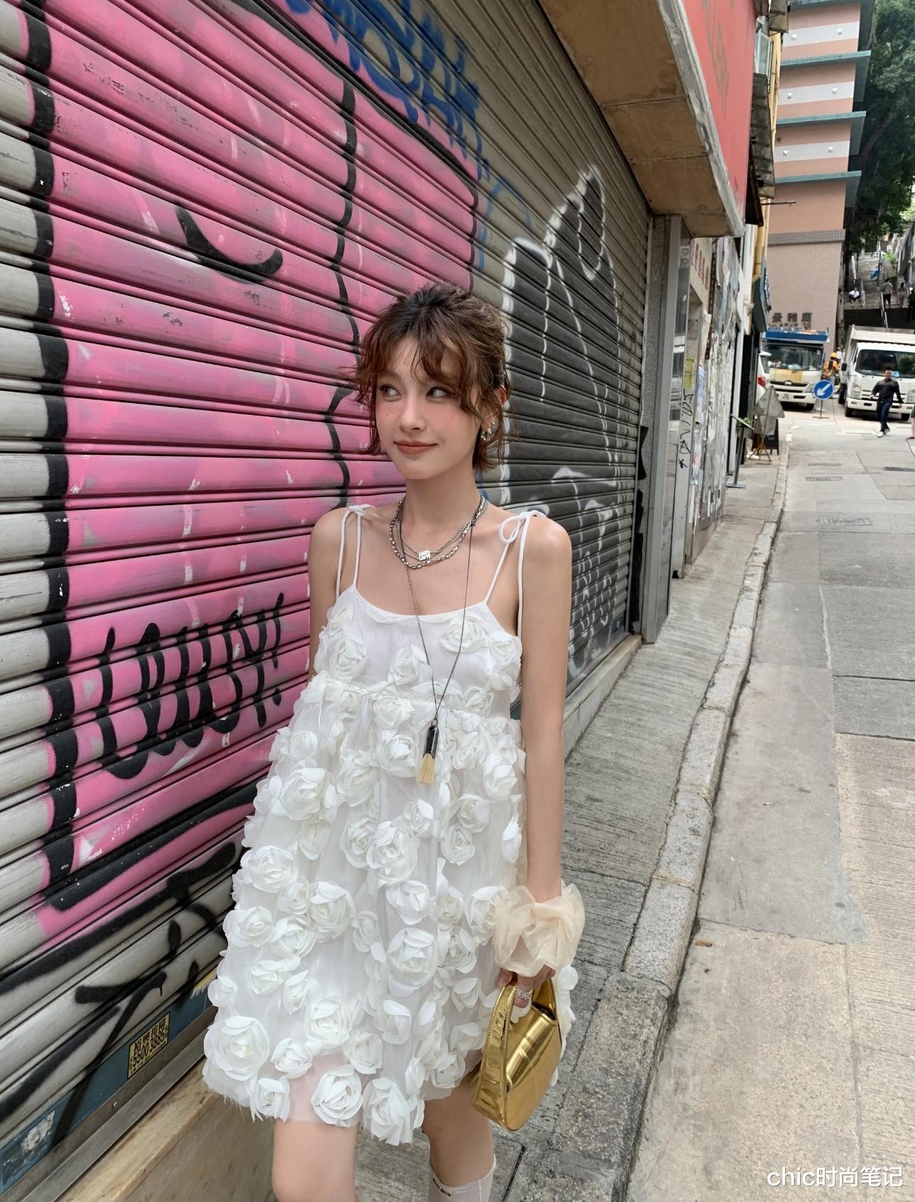 今年春装就流行花朵元素,小碎花、立体花朵等都是时髦利器。一身白色吊带立体花卉连衣裙带着少女感和减龄感,搭配小白袜和小白鞋or单鞋都非常合适。