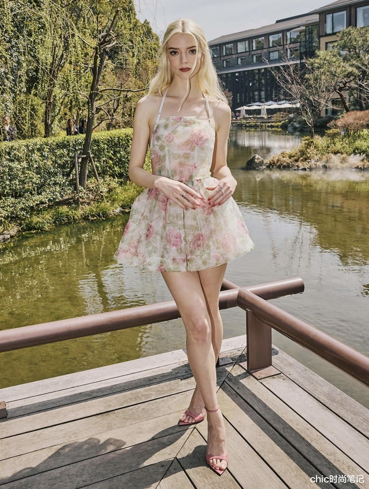 安雅·泰勒-乔伊又又又出新穿搭啦!一身碎花吊带连衣短裙尽显初夏穿搭的时尚魅力。裙子上的粉色花朵图案少女感与氛围感极佳,设计成蓬蓬短裙的款式更加灵动与清新。