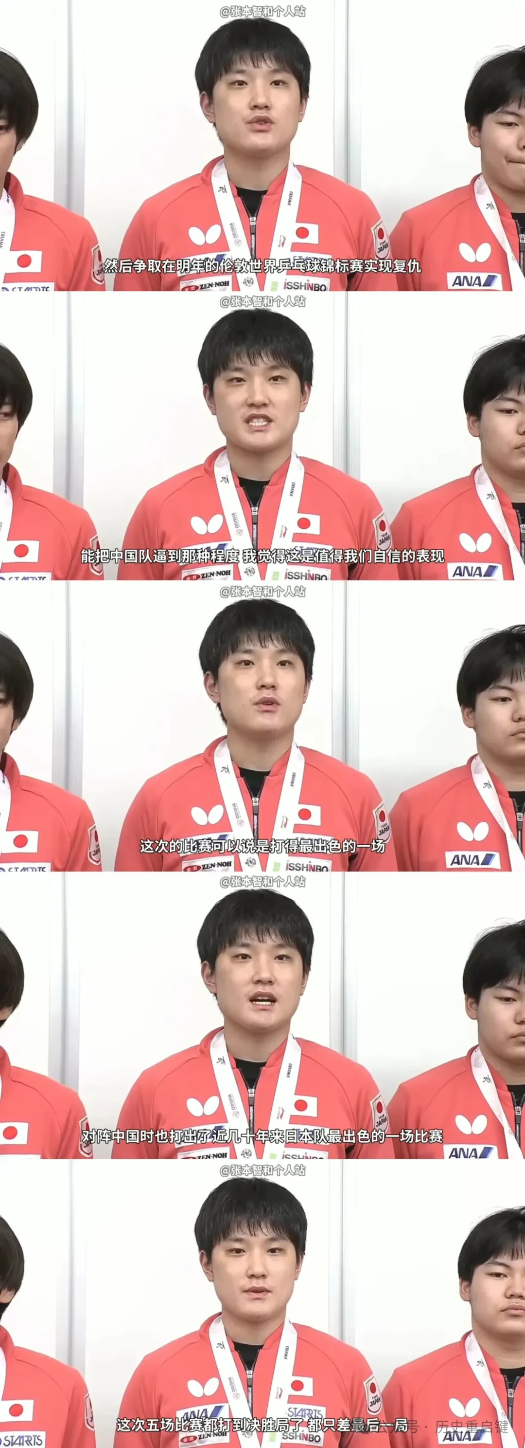 这一趟亚锦赛结束后,日本队陆续回国。机场采访时,张本智和站在C位,面对记者提问,说起那场输给王楚钦的半决赛,他只淡淡地说了两个字——“时运”。