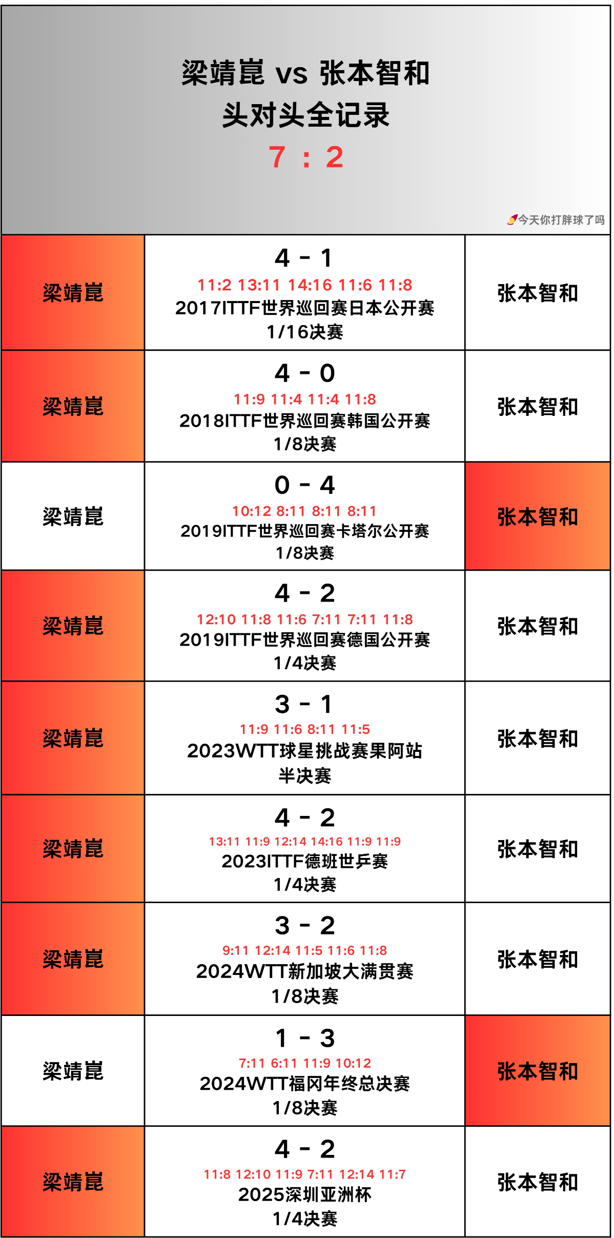 赛后,张本复盘时说:“我和梁靖崑那场五局全是两分之差,对阵王楚钦也是,除了第二局比分都很接近。其实这种比赛,有时候真的就是‘时运’问题。”