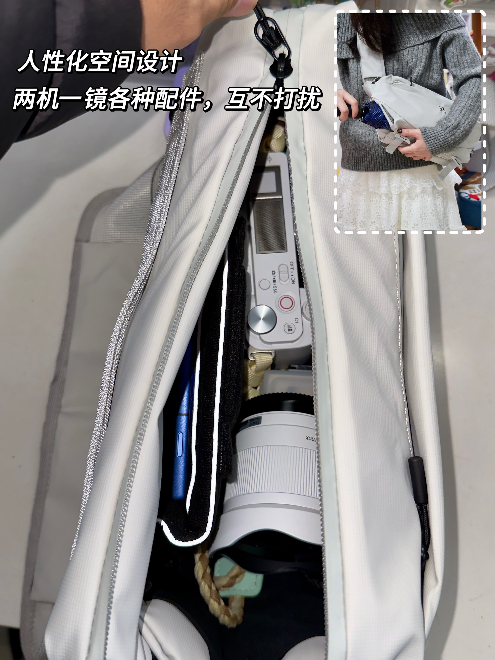 容量方面,虽然它的定位是一款休闲摄影斜挎包,但是它特别能装。在放下两机一镜(微单相机、手机、大光定)的同时,还能放下很多配件。例如:备用电池、充电宝、雨伞、蓝牙耳机、墨水屏阅读器等等。并且,在主仓内还有魔术贴隔板,可以根据需求进行容量划分,保证它们在包里不会“打架”。