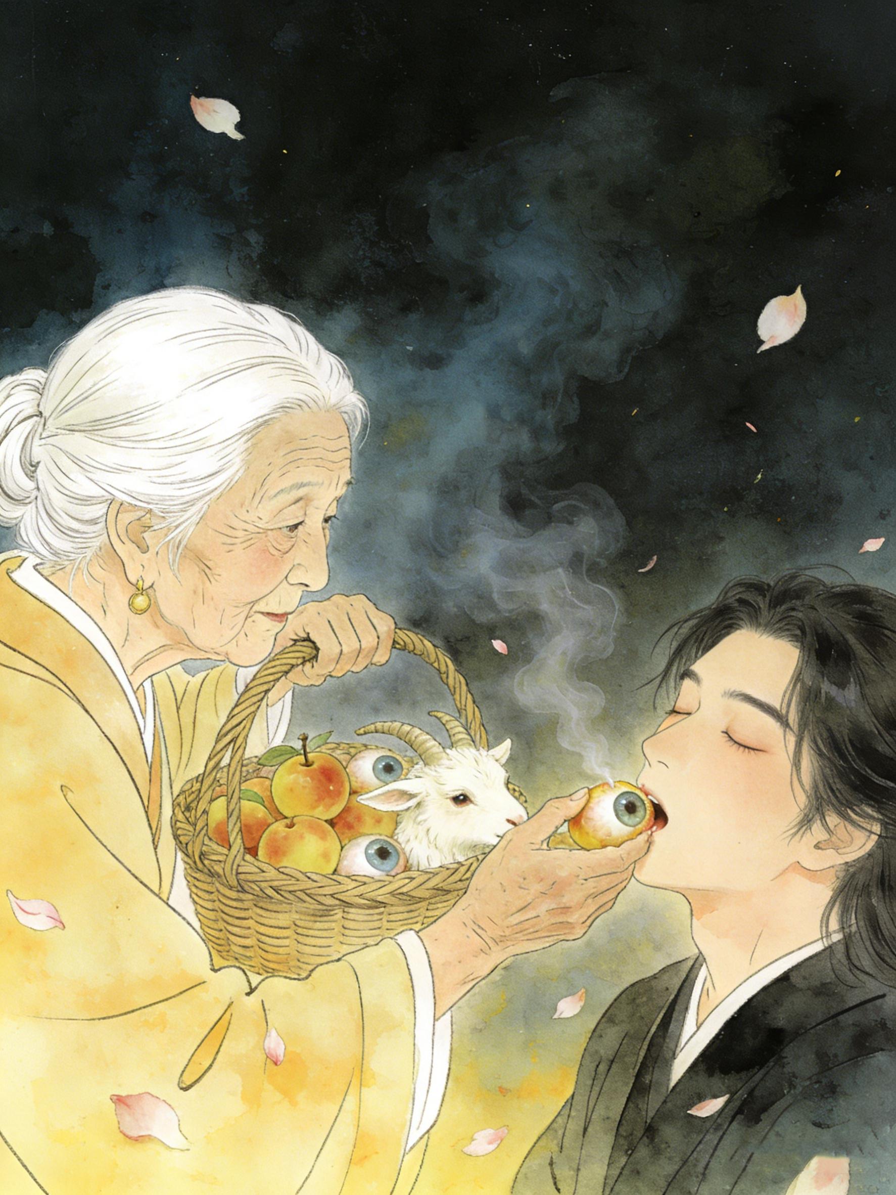到了第三天夜里,他梦见一位老婆婆,先是给了他一些杏和李子吃,又拿来一把羊眼,让他用嘴吸吮。