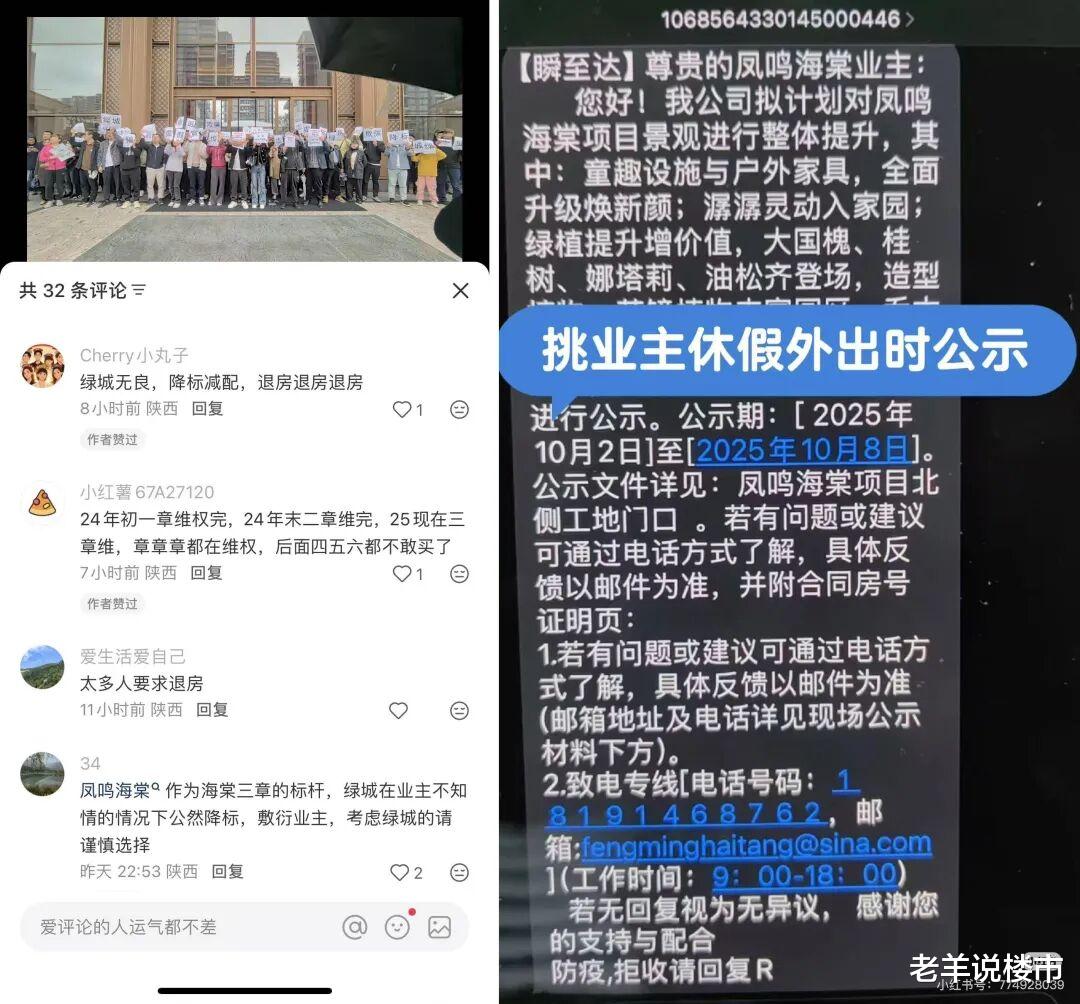 近日,丝路软件城软东片区的绿城凤鸣海棠(海棠三章:月映海棠、春熙海棠、凤鸣海棠)再陷降标维权风波,被质疑水系、绿化、公区降标缩水,并且选择在假期(10月2日-8日)在凤鸣海棠项目北侧工地门口公示整改文件,引发业主不满。