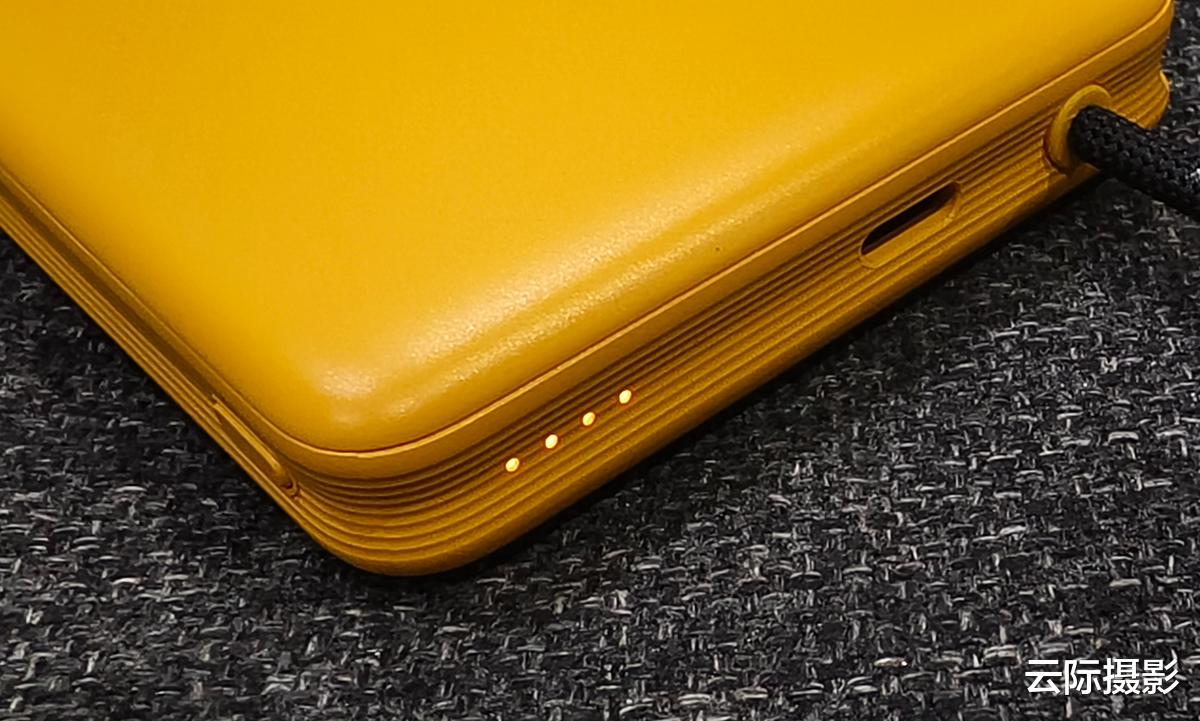 在充电宝的外观设计。其配色为急速黄,而整体造型则简约大方,磨砂的外壳加持四周凹陷纹理设计,不仅手感舒适且具有一定的防滑性。厚度约为1.5厘米,重量则只有177克。