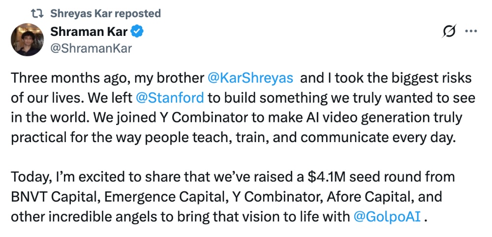 三个月前,Shreyas Kar和Shraman Kar从斯坦福大学辍学,专注于Golpo AI的公司业务。