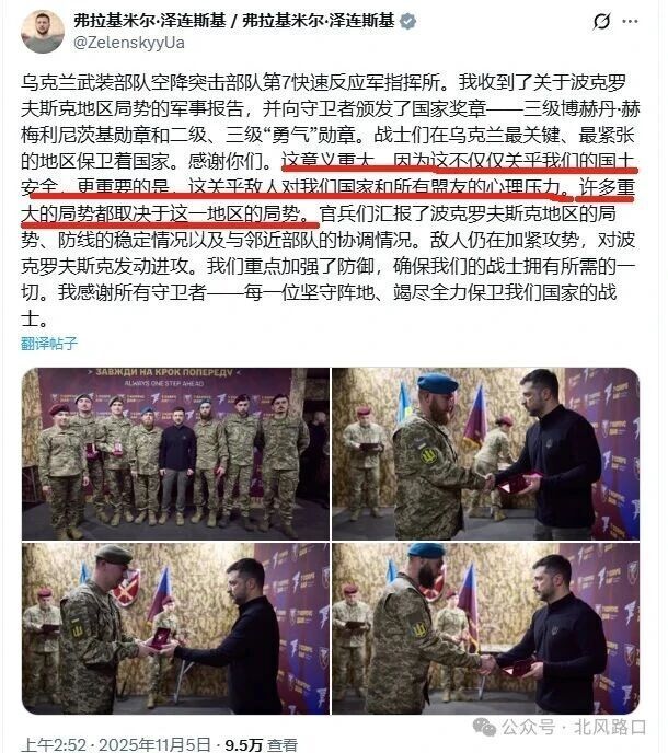 11月4日,泽连斯基视察波克罗夫斯克-多布罗皮利亚前线,泽连斯基先后视察乌军第25旅,亚速第一军,第7突击军、第414无人机旅等部队,并向士兵颁发国家奖章。