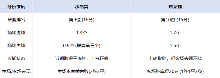 · 水晶宫:防守稳固,进攻端有保障:水晶宫本赛季防守表现非常出色,是联赛失球最少的球队之一 。同时,他们近期状态上佳,各项赛事取得三连胜,且这三场比赛都攻入了2球或以上,显示进攻端也有不错的表现 。此外,他们主场气势很强,已连续13个主场正式比赛保持不败 。