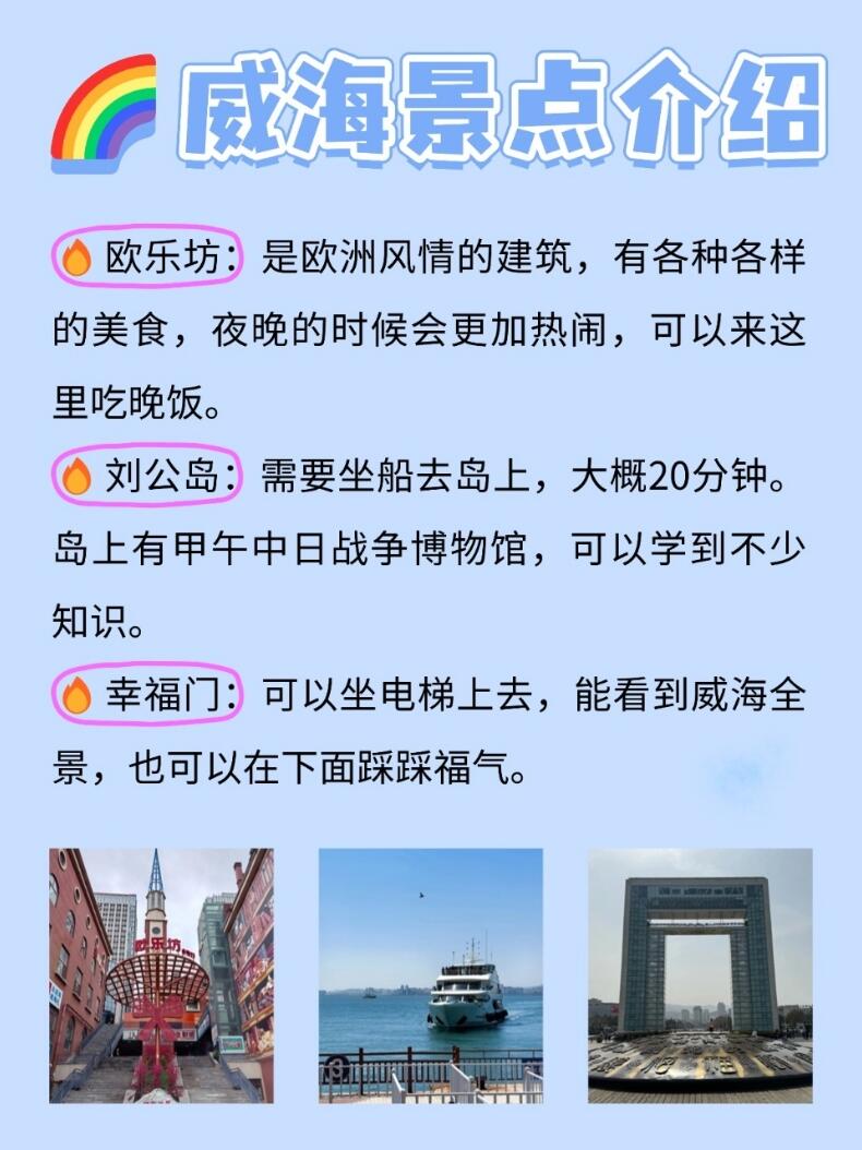 🔥威海公园:可以过来打卡威海大相框,是威海的标志性建筑物!有很多专业的摄像师,拍照很漂亮。🔥欧乐坊:是欧洲风情的建筑,有各种各样的美食,夜晚的时候会更加热闹,可以来这里吃晚饭。
