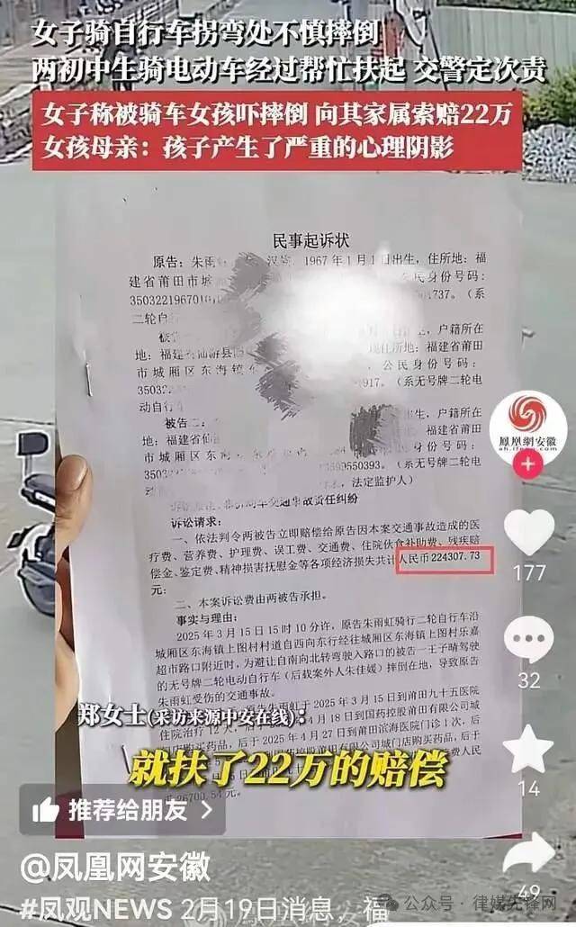 没想到,二女生事后反遭22万多元的民事索赔,理由是受到惊吓。这就可大可小,很难量化了。并且,其惊吓显然源于与白轿车交会时,然后才失控、摔倒,而非后来的女生车辆。