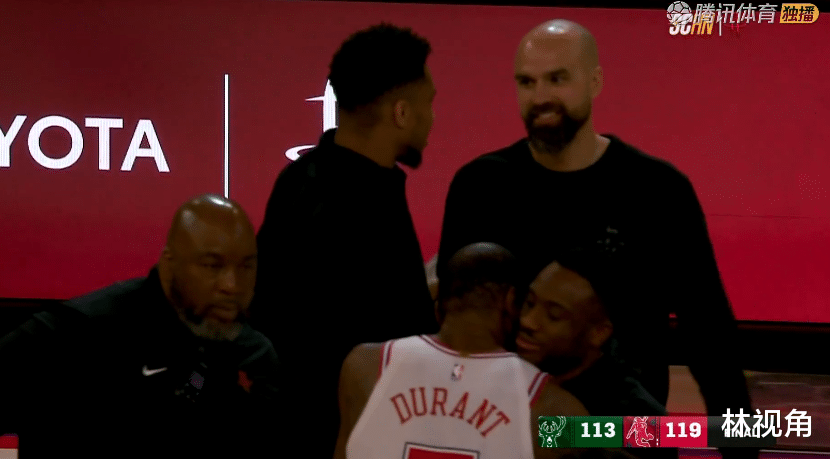 比赛结束,双方球员很友好,在场上互相拥抱致意,字母哥哥也走入场内,先是和杜兰特拥抱,又拉着阿杜热聊。
