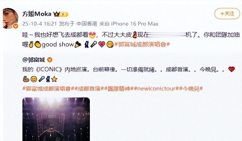 其实这事早有“伏笔”。9月底港媒突然爆“方媛生了儿子”,连“凌晨三点剖腹产”“郭富城守了整宿”都编得像真的,网友还替她松口气:“终于给老郭家续上根了。”结果10月4号,方媛发了条朋友圈,说“大着肚子没法去成都看演唱会”,评论区有人小心问“卸货没”,她回了俩字:“快了。”隔天郭富城在演唱会上直接怼回去:“别瞎猜,男女都一样,健康就好。”