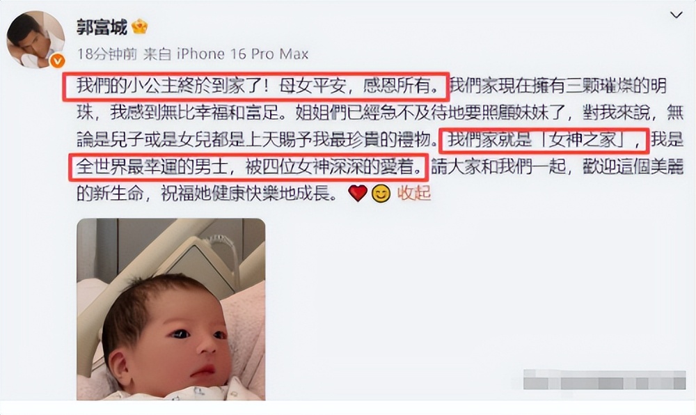 可网友偏不买账。有人说他文案“强调生女儿开心,反而此地无银”;有人揪着照片里的毯子不放:“方媛平时把俩女儿打扮得跟小公主似的,三胎用起球的旧毯子,肯定是不重视”;更难听的是:“没有儿子,没人看得起她”“郭富城再有钱,也是外公相”“肯定还会拼第四胎”。