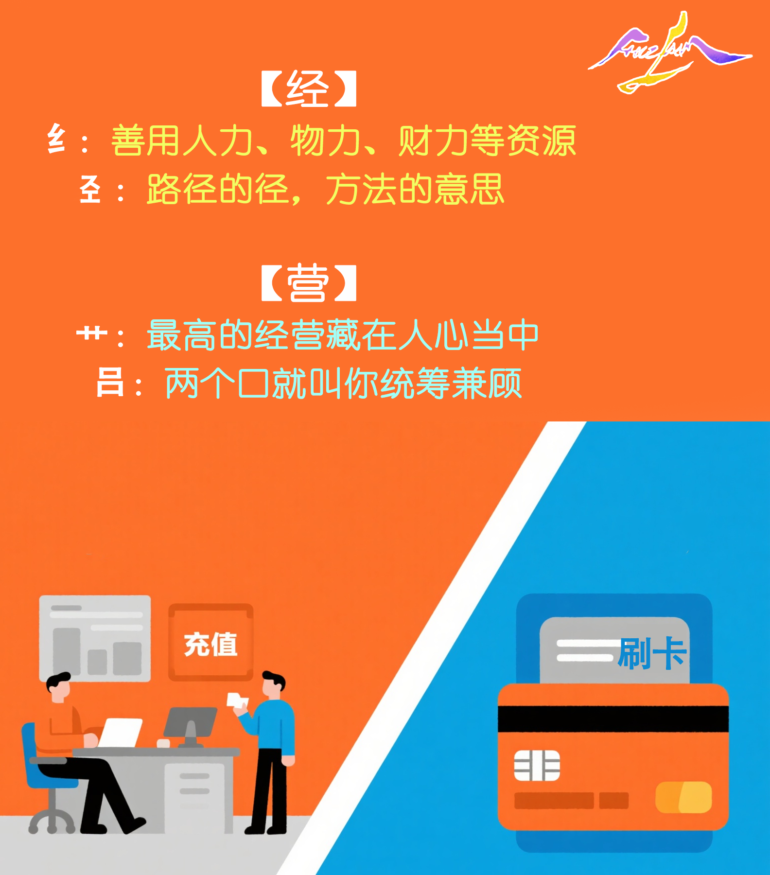 “最高经营在人心,统筹兼顾大智慧”,“营”的草字头就是告诉你,最高的经营藏在人心当中。“营”上面一个小口,下面一个大口,就叫你统筹兼顾。你只知道钱怎么用,不知道人怎么用,不知道这些关系怎么统筹兼顾,那不叫会经营。
