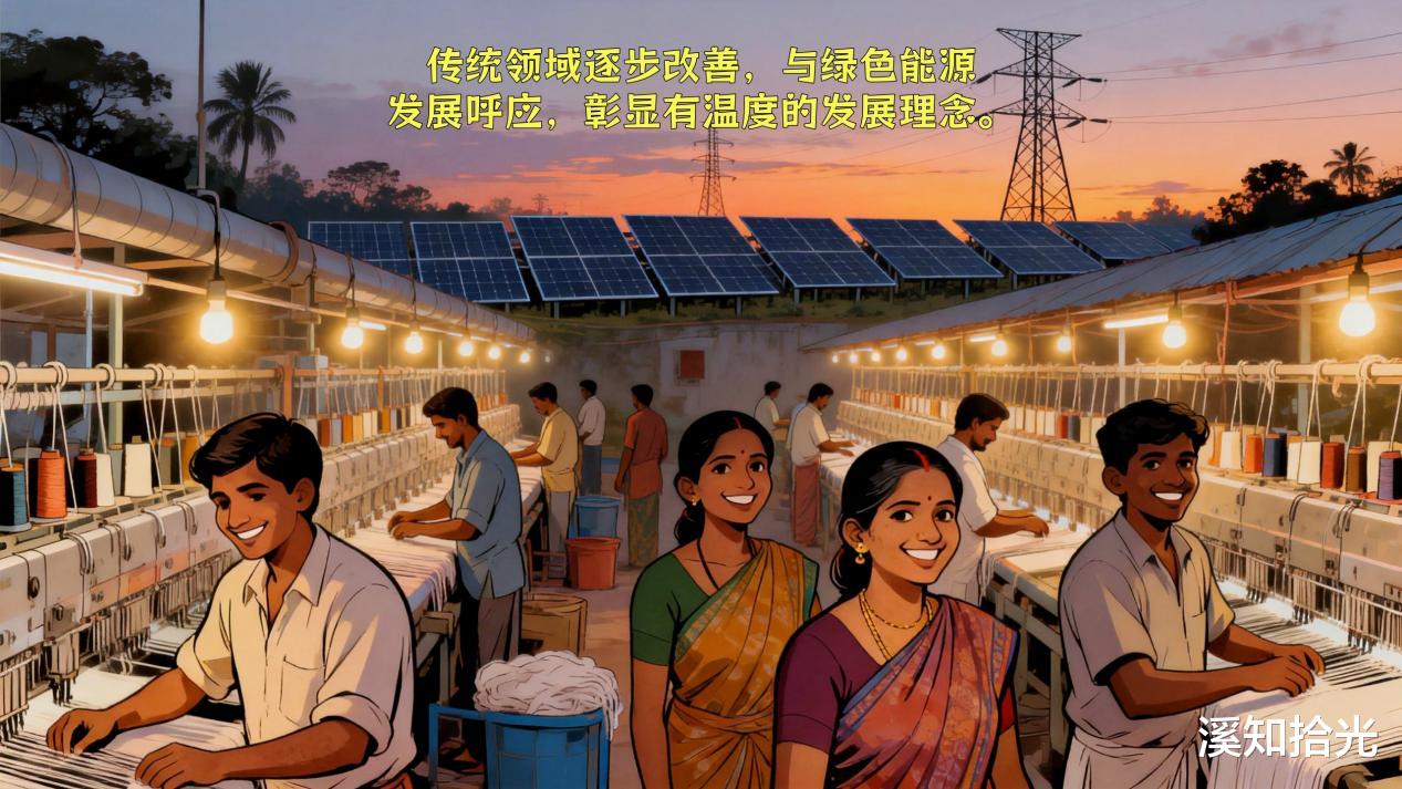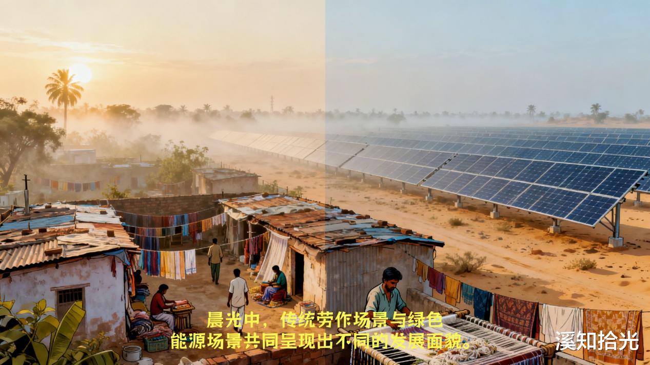 一边是缝纫机旁无数劳动者对安全尊严的朴素渴望,一边是拉贾斯坦邦荒漠中光伏板阵列在朝阳下泛起的蓝色光晕。