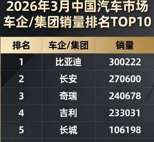 3月份中国汽车品牌销量榜单很有意思,比亚迪超过30万辆继续霸榜领跑,重回去年单月40万辆指日可待,要知道比亚迪最高月销超50万辆持续了一段时间,随后是长安汽车,27万辆之多。