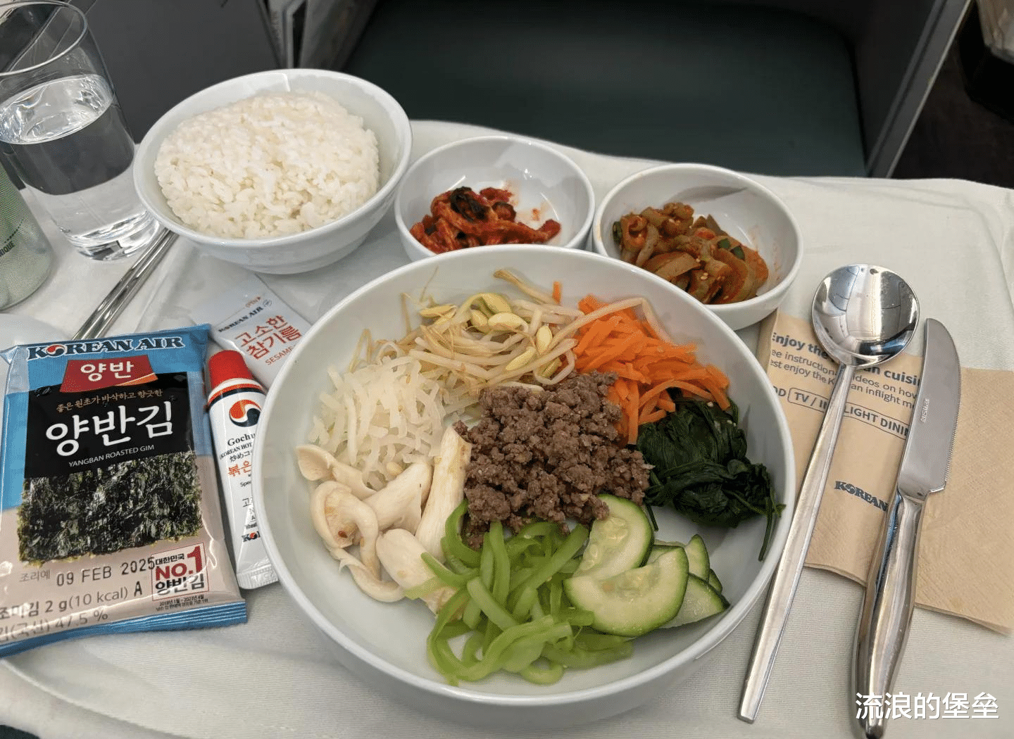 韩国的飞机餐很有当地特色,我们最常见的韩式拌饭在飞机上就能吃到,几种平时吃的蔬菜,豆芽必不可少,用来拌饭吃,准备还了海苔碎的拌饭酱,唯一少了的就是我们认知里的辣白菜!感觉好像缺了点什么!