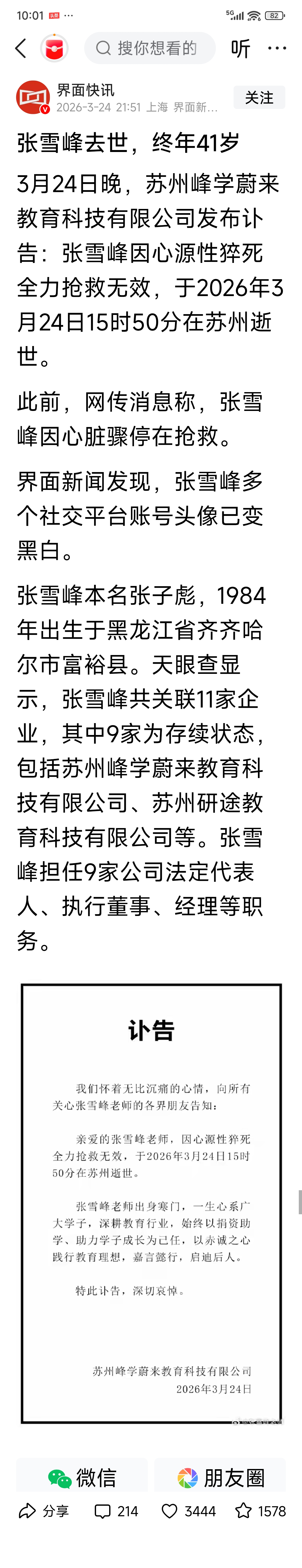 据《界面快讯》2026年3月24日报道——张雪峰去世,终年41岁!
