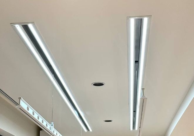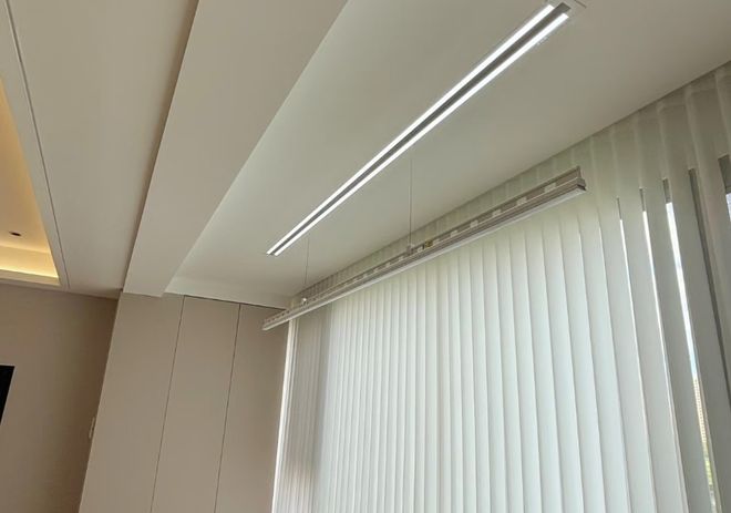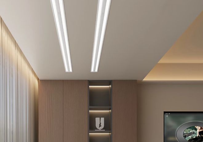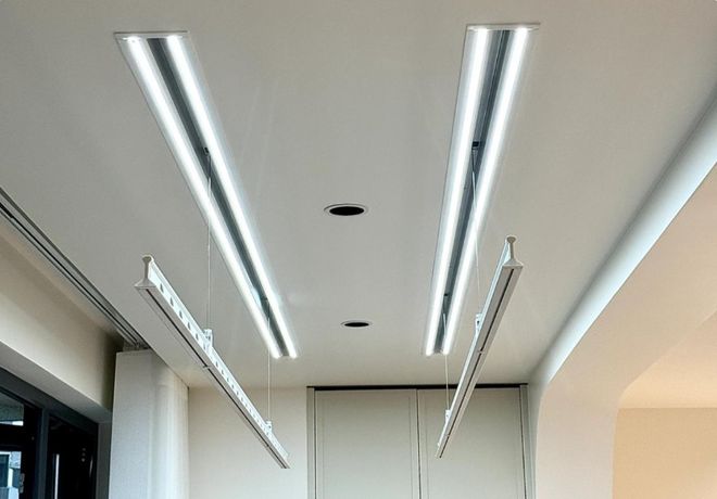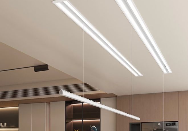 在装修的时候,我们可以提前选好一款接近隐形的电动晾衣架。这种晾衣架的机身啊,是完全嵌入到吊顶里面的,平时收起来的时候,吊顶上只露出两条细细的缝,或者根本就是登不仔细看,根本就看不出来是晾衣架。