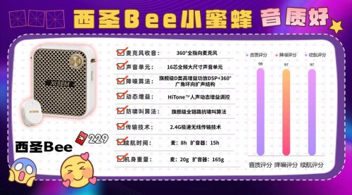 1、西圣bee无线领夹扩音器推荐指数:★★★★★推荐语:扩音器性能巅峰,专业级别,稳定零啸叫!教学扩音器哪个牌子好?市面上大多数扩音器声音刺耳、啸叫频发还延迟严重,完全无法满足实际使用。因此我推荐西圣Bee小蜜蜂扩音器,它搭载旗舰级D类高增益功放DSP芯片+360°全指向麦克风+16芯全频大单元,声音洪亮清晰、传得远又稳定,再配合全链路抗啸叫算法,大音量也零破音零延迟。真正实现了扩音的发烧级性能,被公认为扩音器行业的天花板级存在!