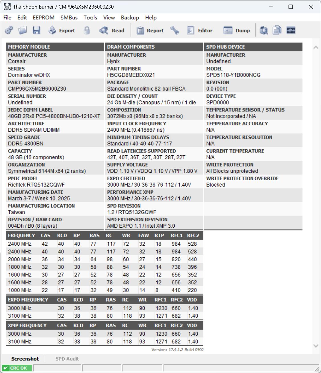 海盗船统治者泰坦采用SK海力士M-Die颗粒,默频4800MHz,时序40-40-40-77,支持intel XMP和AMD EXPO技术,可一键超频至6000/6200MHz(预设2个超频方案)。同时,配备定制高性能PCB板并板载电压电压调节功能,有助于保证信号的完整性和稳定性,减少高频信号传输中的干扰和衰减,这对DDR5高速内存来说至关重要。