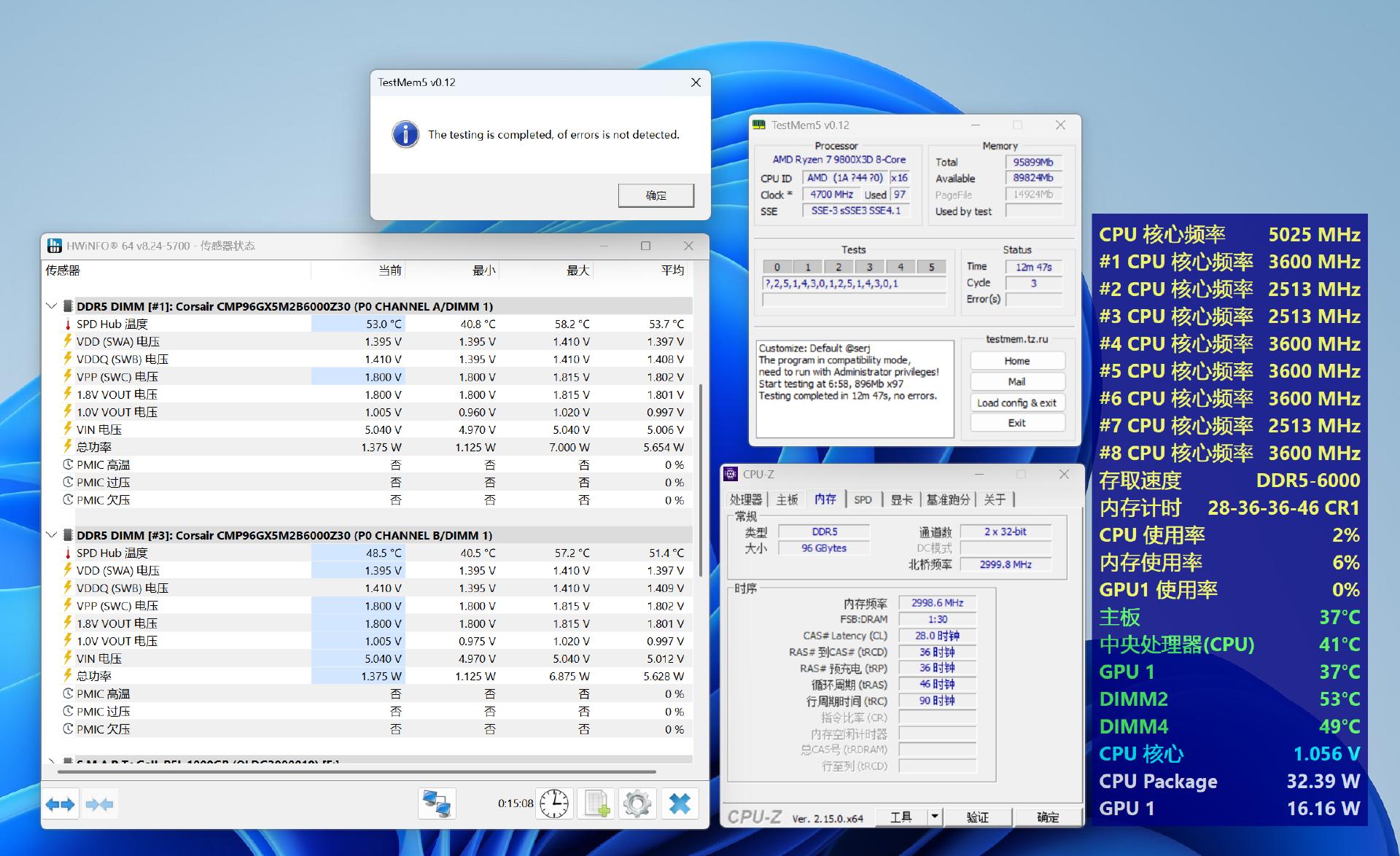 开启EXPO一键超频至6000MHz,时序30-36-36-76,性能测试相比默认频率有大幅提升: