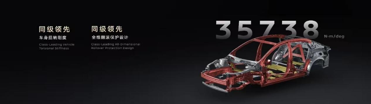 安全方面,新车使用高刚性笼式车身结构,35,738 Nm/deg超强车身扭转刚度,1500MPa高强钢防撞梁。新车两侧车身通过设置STAY结构,预留空间的380mm安全距离,发生侧碰事故时,STAY结构率先产生溃缩变形,大幅降低碰撞冲击力直接传导至电池包的风险。