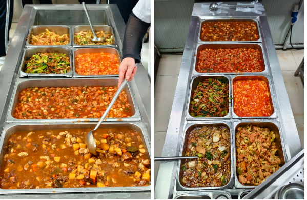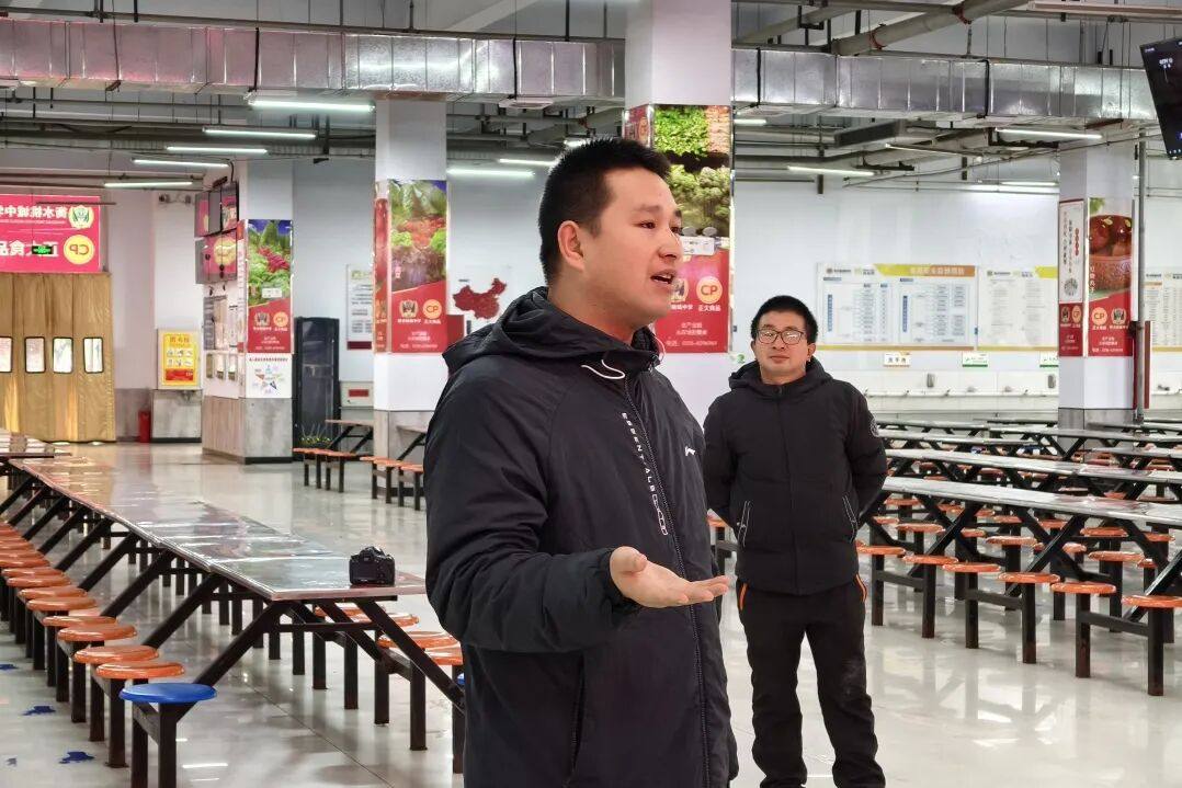 在食堂工作人员的引导下,学生代表们沿着 “副食库—主食库—烙制区—大灶加工区—留样区—售饭间” 的路线依次参观。每到一处,工作人员都耐心讲解食材采购、储存、加工、留样等全流程细节:副食库内分类摆放的新鲜蔬菜、肉类,主食库中整齐码放的米面粮油,烙制区里师傅们娴熟制作面食的场景,大灶加工区严格的卫生操作规范,以及留样区按标准留存的每餐样品,都让同学们对校园餐食的 “从源头到餐桌” 有了清晰认知。