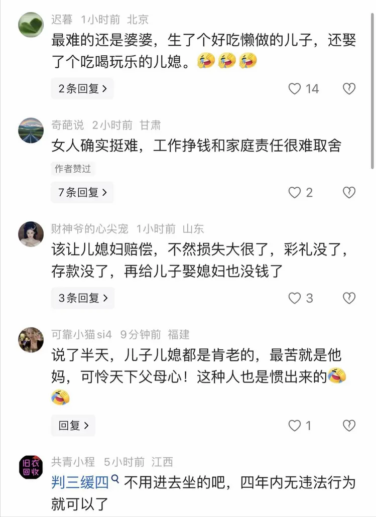 小编观点躺平儿子, 估计已经让这位母亲心力憔瘁了,如今又遇上这么一位不懂事的儿媳妇,给婆婆的的伤口上又撒了一把盐。一对巨婴,扶不起的阿斗,只是可怜了这位老母亲。