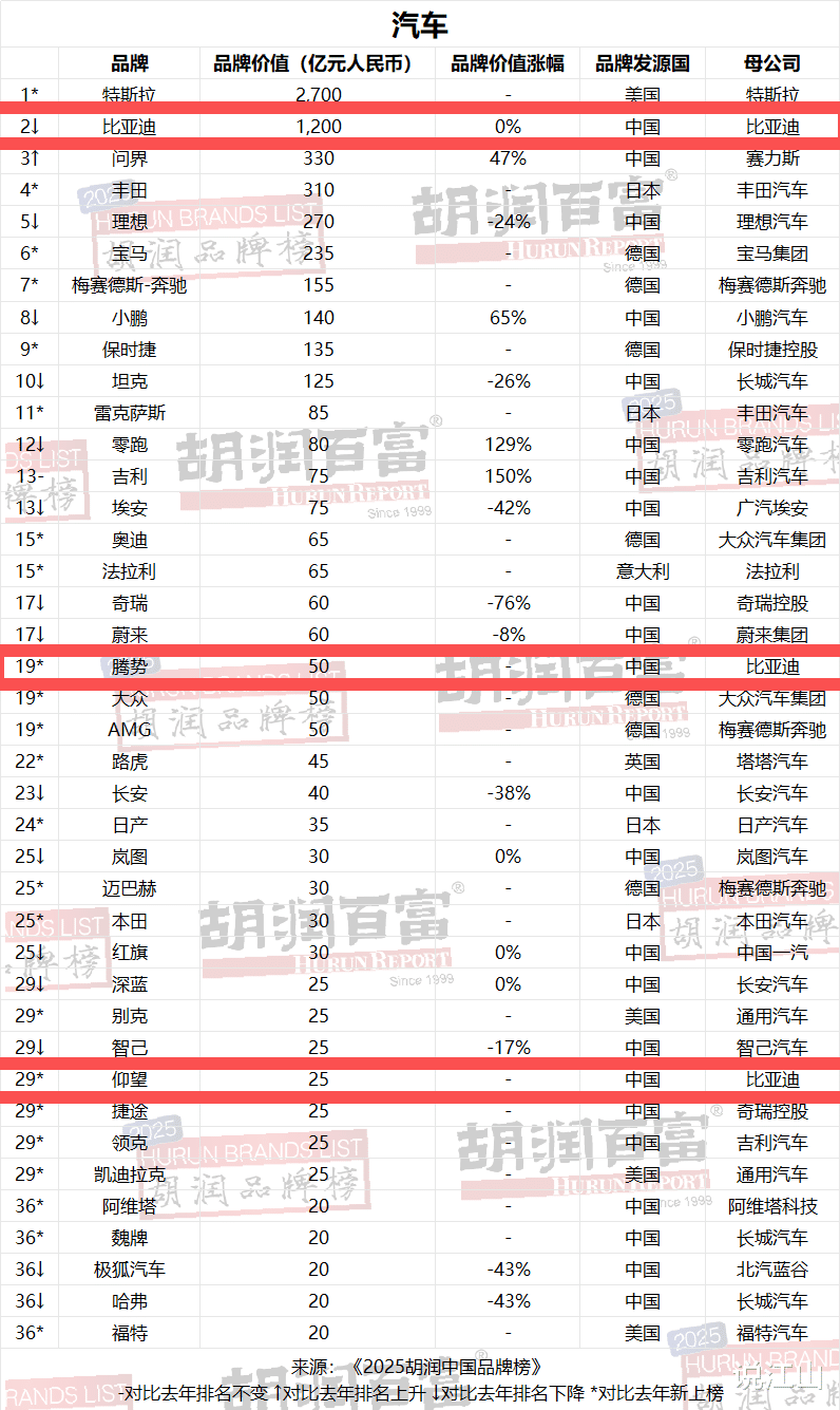 2月3日,规则调整后的2025胡润汽车品牌榜出炉。榜单显示,比亚迪以1200亿元品牌价值连续四年蝉联中国汽车品牌第一名。