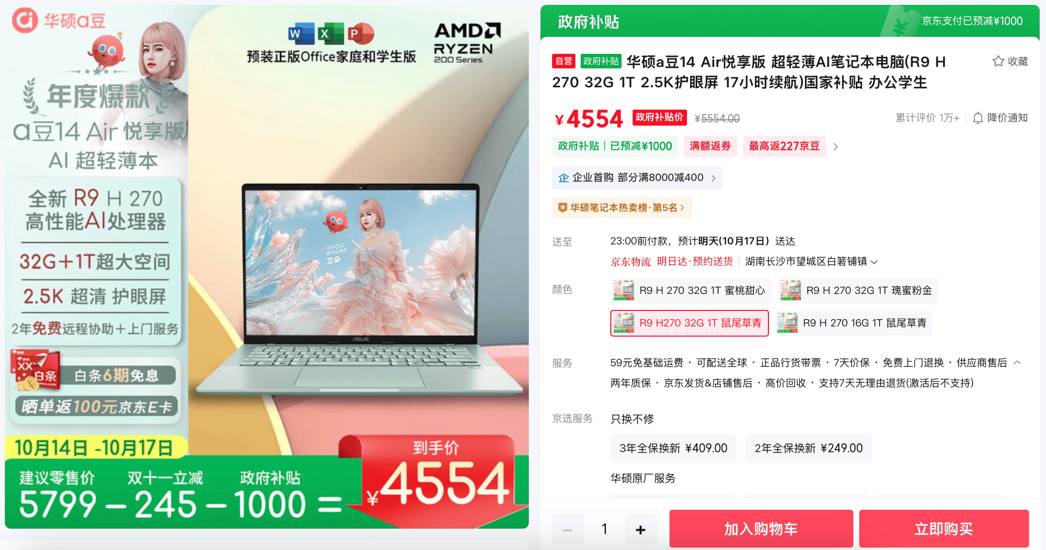 双十一大促购机立减245元,还有1000元政府补贴(购机活动详情还请咨询店内客服),到手仅4554元,还支持白条6期免息、晒单返100元京东E卡等福利,并可免费加入a豆无忧服务计划(包括2年整机国际保修、2年硬件专家上门服务、2年不限次远程协助)。