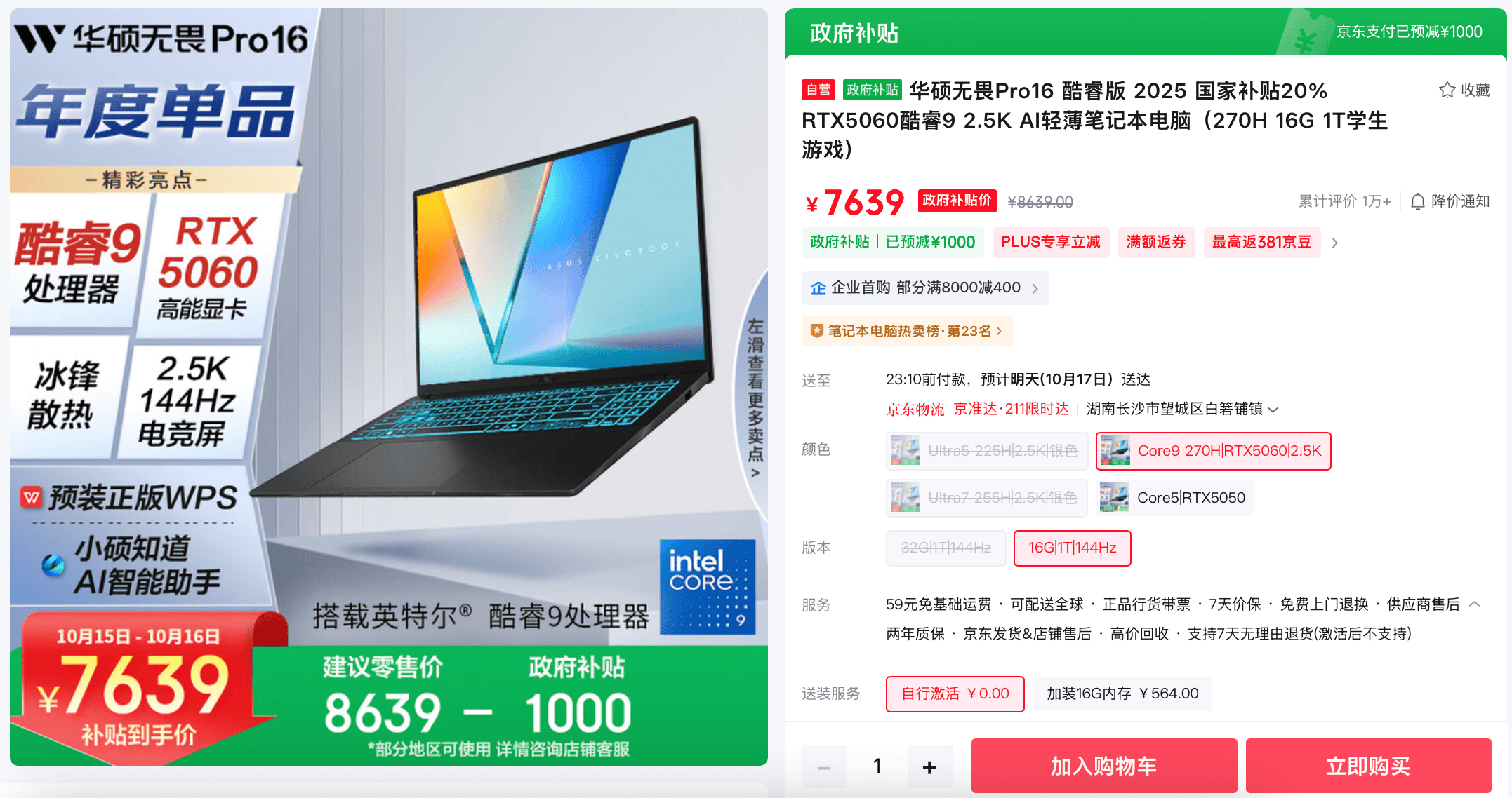 华硕无畏Pro16 2025潮流酷炫,到手7639元