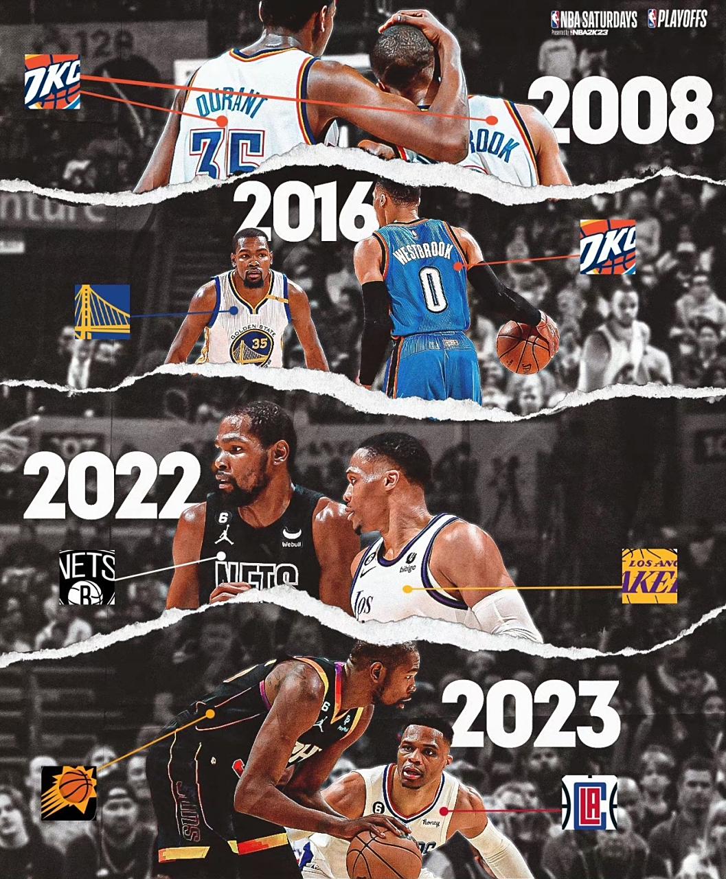 值得一提的是,两人生涯唯一一次季后赛层面的直接对话,出现在2023年。彼时太阳对阵快船,在乔治和莱昂纳德相继伤停的情况下,威少几乎扛起了快船的攻防重任,同时还承担了主防杜兰特的任务。系列赛最终以太阳4比1取胜告终,但威少场均仍能贡献23.2分、7.4篮板、7.0助攻和1.4次抢断,展现出极强的对抗强度。杜兰特则保持高效输出,场均28.4分、7.6篮板、5.8助攻,稳定发挥核心价值。