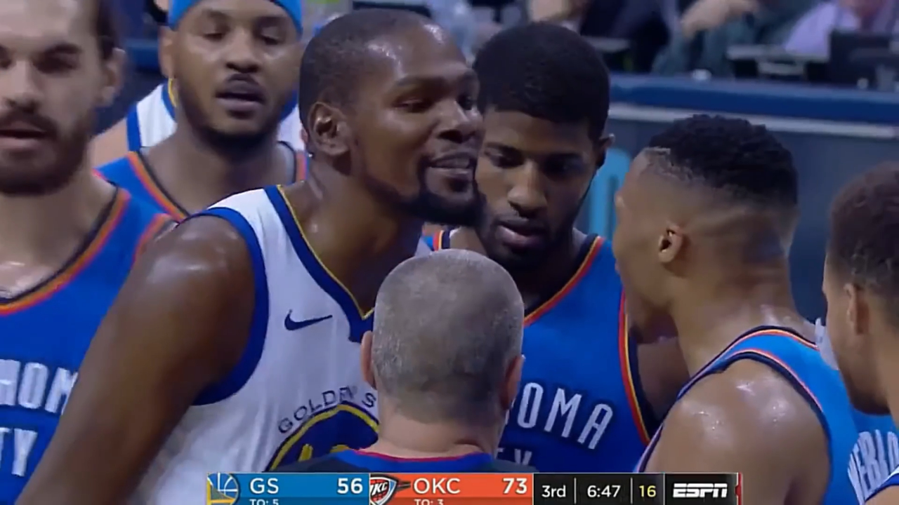 如果说此前的交锋更多是情绪堆积,那么2017年11月23日的那场比赛,则是火药味最浓的一次。此时的雷霆已经完成阵容升级,乔治和安东尼相继加盟,但所有人的目光依然集中在威少与杜兰特身上。比赛中,两人多次形成直接对位,进球后的眼神交流、肢体接触和垃圾话,让比赛氛围不断升温。