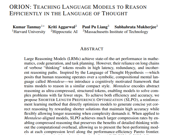 来自哈佛大学、加州理工学院MIT和Hippocratic AI的研究团队在2025年11月发表了一项突破性成果,论文题目为"ORION: Teaching Language Models to Reason Efficiently in the Language of Thought"。这项研究发表在顶级会议的评审中,感兴趣的读者可以通过论文编号arXiv:2511.22891v1查询完整内容。